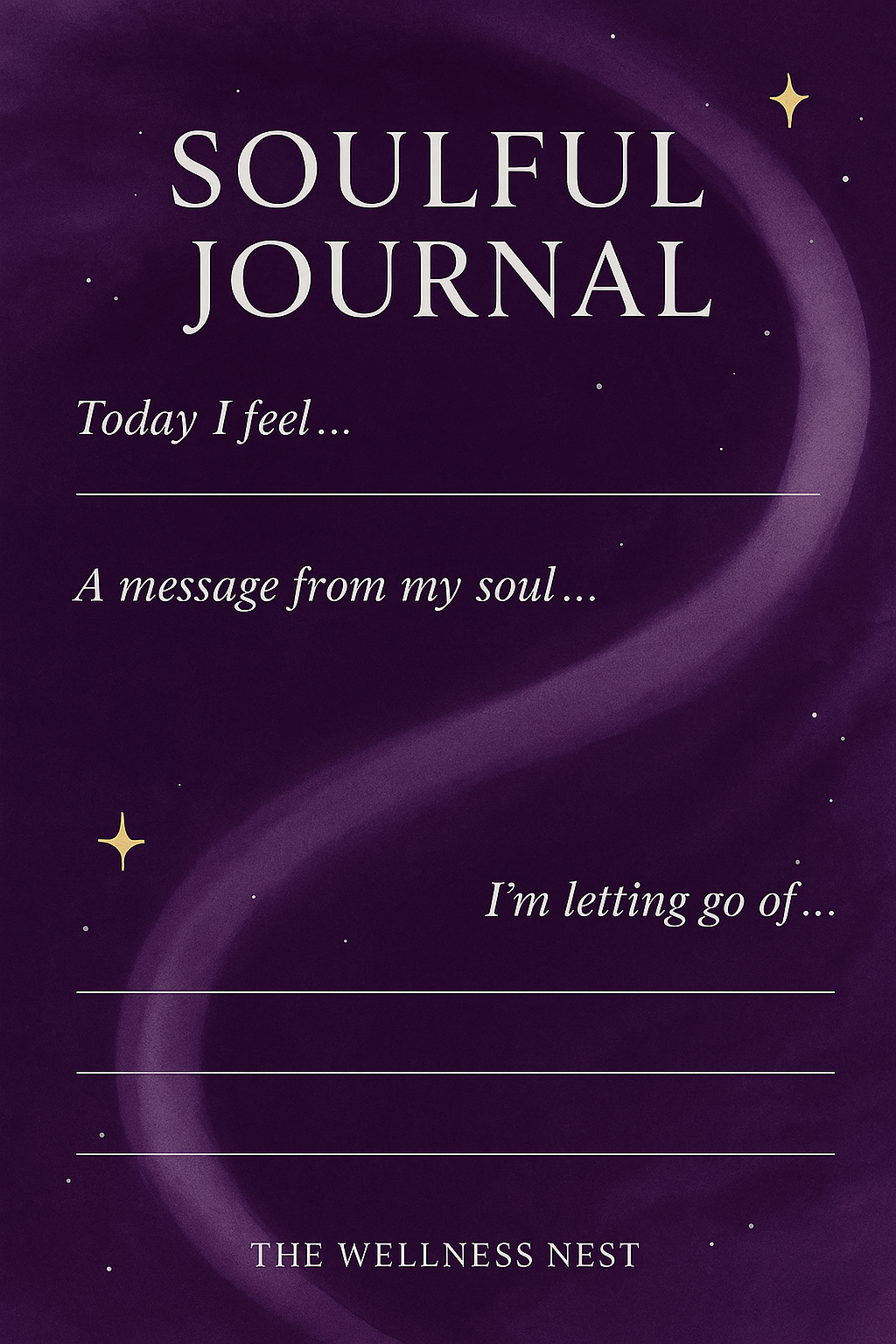 Welcome to a sacred space for self-reflection. This Soulful Journal Page from The Wellness Nest invites you to slow down, breathe deeply, and reconnect with your inner wisdom. Set against a deep purple, cosmic-inspired background, this printable journal sheet blends soulful prompts with a mystic design—perfect for spiritual seekers, moon lovers, and anyone navigating growth with grace.