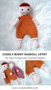 The Cuddly Buddy Ragdoll Lovey is a toy that has a flat body, mimicking a security blanket for babies, toddlers, and young children. This no-sew pattern creates the perfect pal for your little one to love on!