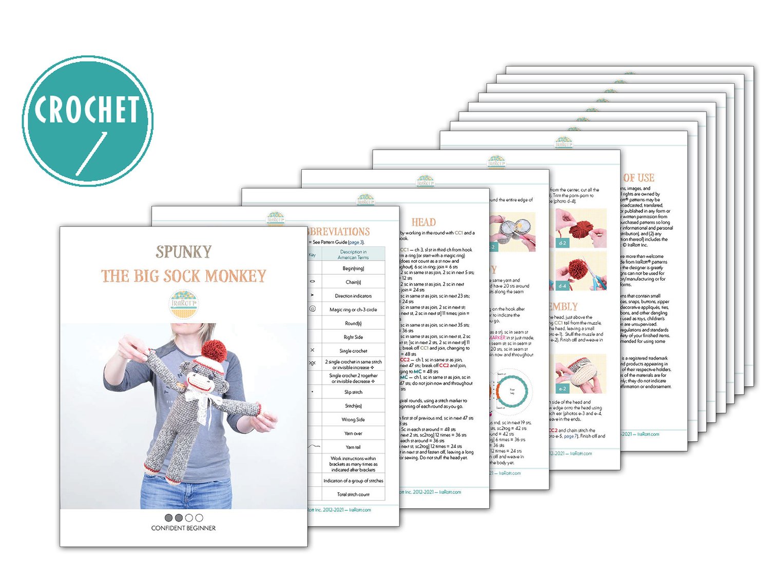 Spunky the big sock monkey is made from yarn and not from socks. He is quiet and shy but loves to make new friends. This pattern is written row-by-row using US crochet terms. It also includes crochet diagrams, step-by-step photos, and a conversion chart to UK terms.