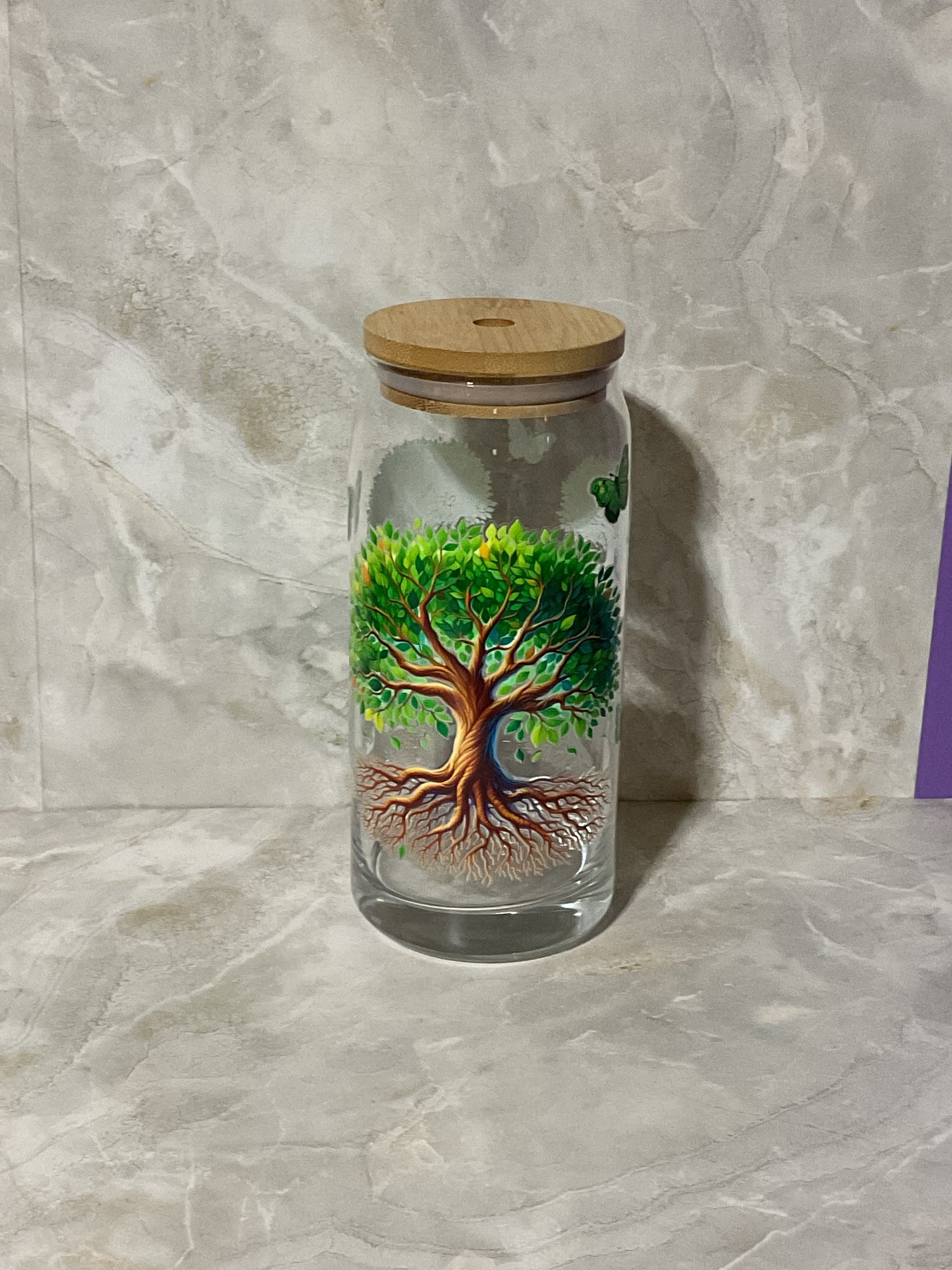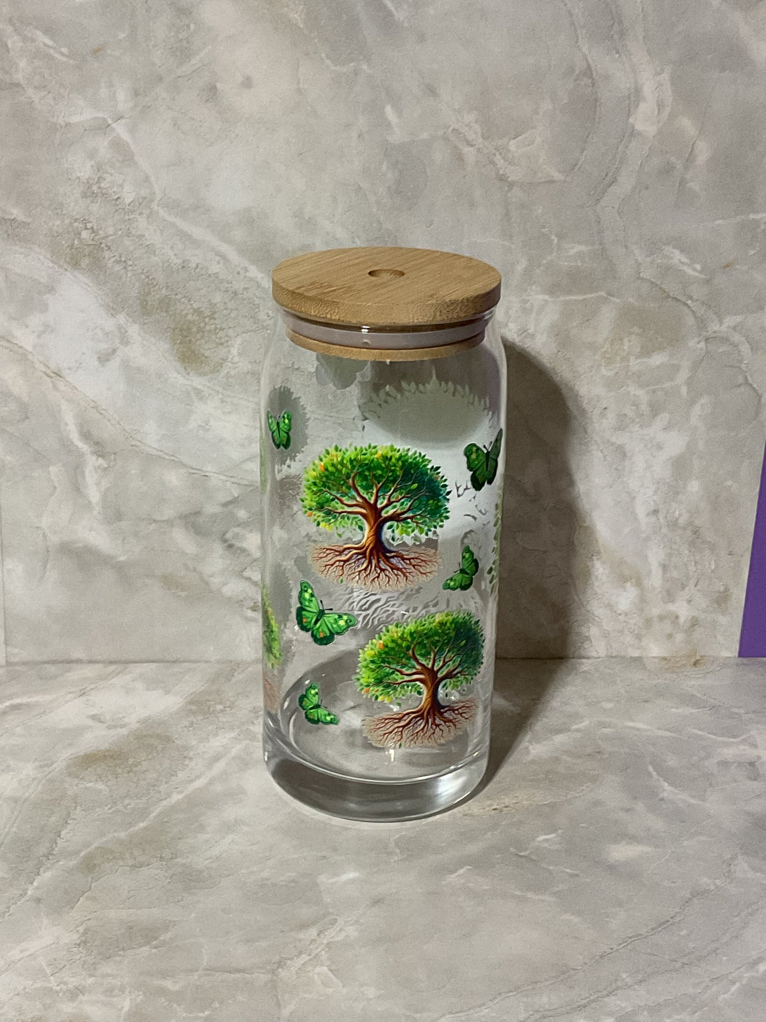 This 16 oz glass can cup features a vibrant Tree of Life design symbolizing growth, healing, purpose, and new beginnings. Perfect for your daily water, iced coffee, smoothies, or herbal tea. Comes with a bamboo lid and reusable straw.