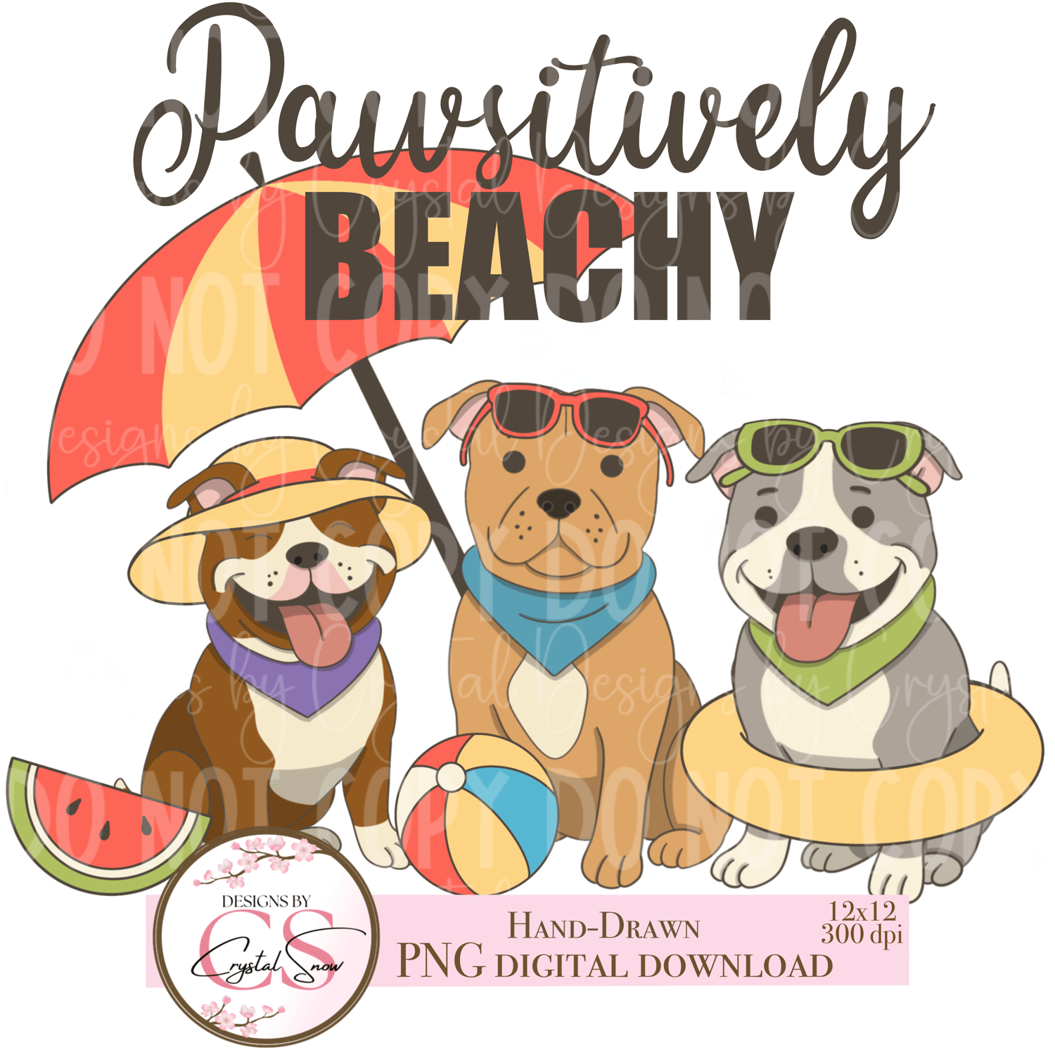 This dog-lover-friendly set includes three individual pitbulls, plus two group PNGs (one with the phrase “Pawsitively Beachy” and one without). Each image is hand-drawn with summer vibes — beach balls, sunglasses, watermelon, and more. These 300 DPI transparent PNGs are perfect for sublimation, printing, or layering in your favorite software. Great for custom gifts, pet-themed projects, or selling finished items in your shop!
