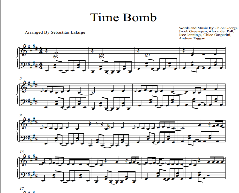 Dive into the electrifying world of The Chainsmokers with this captivating piano arrangement of "Time Bomb" by the talented Sebastián Lafarge. This sheet music is meticulously crafted for advanced pianists, offering a challenging yet rewarding experience for those seeking to master this dynamic piece.