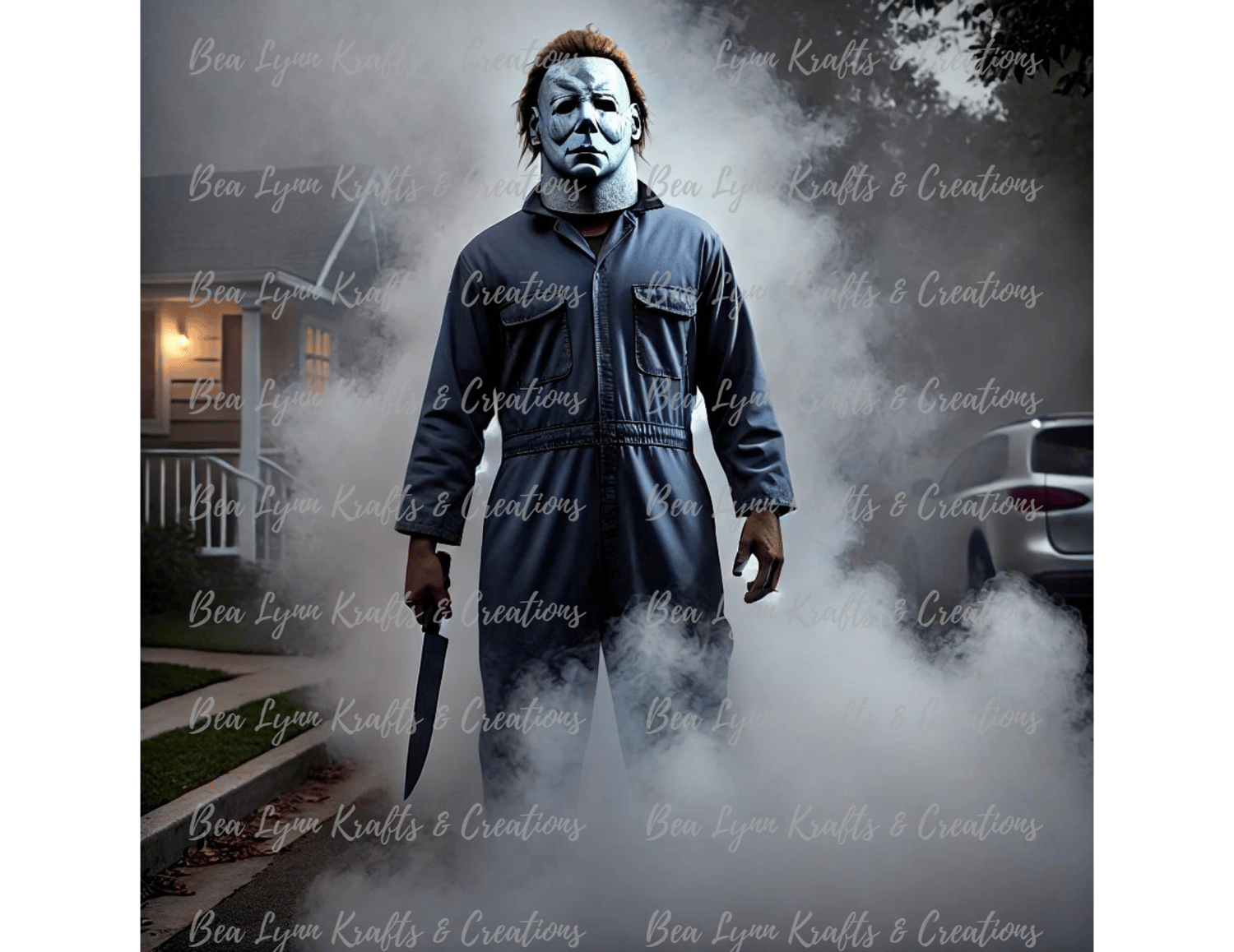 This is a high-quality, transparent PNG image of Michael Myers, shrouded in thick fog, with his menacing stance and expressionless mask peeking through the mist. Perfect for adding an eerie, Halloween-themed touch to your creative projects. Ideal for use in party invitations, custom t-shirt designs, posters, stickers, mugs, and more! The spooky ambiance created by the dense fog makes this image a standout choice for any horror or Halloween-related product.