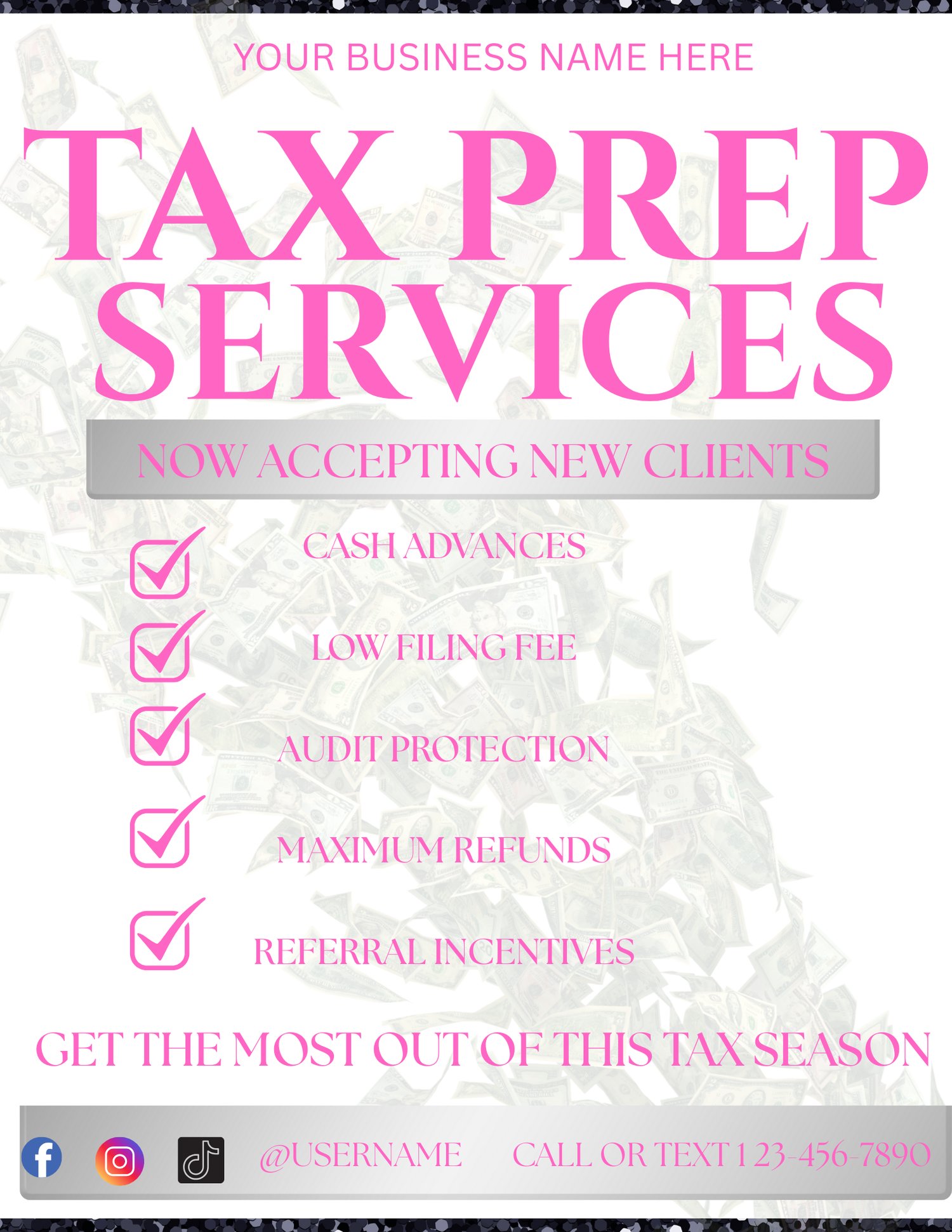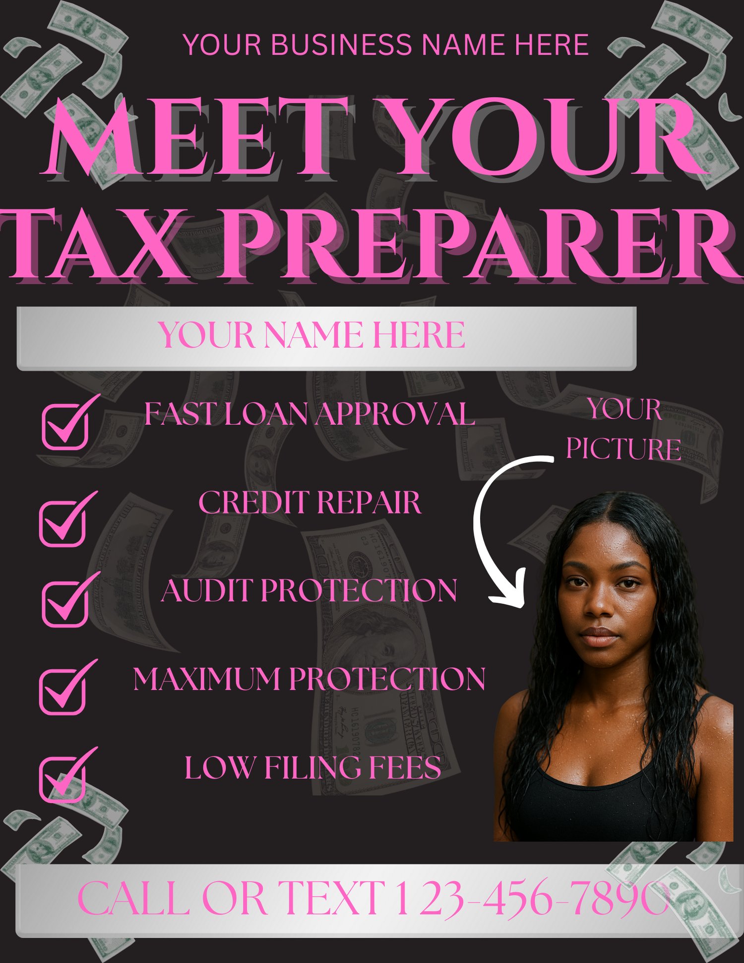 Custom flyers & templates designed to help tax preparers attract clients and build trust — from professional promo flyers to personalized ‘Get to Know Your Preparer’ designs.