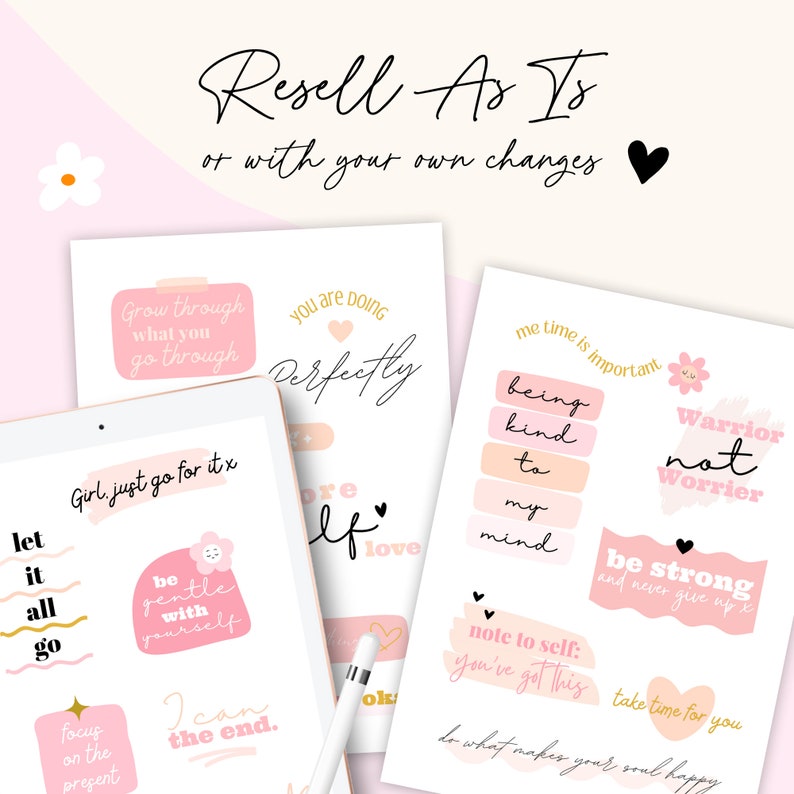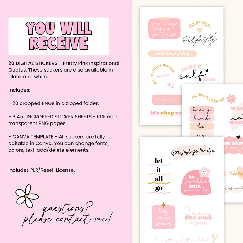 Hashtags: #InspirationalStickers #DigitalStickers #PLRResell #GoodNotes #MentalHealth #CutePink #CanvaTemplates #iPadStickers #PrintableStickers #MotivationalQuotes