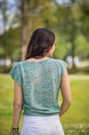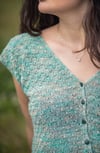 This tee is worked from the bottom-up and seamlessly. It features a tubular cast-on in the ribbing and the shoulders are seamed with a three-needle bind-off. The button bands are worked simultaneously with the body of the garment, so there are no finishings to be made after. Just bind off, weave in your ends, and wear it proudly!