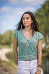 É tricotada de baixo para cima e sem costuras. Inclui uma montagem tubular no cós e os ombros são unidos com remate a 3 agulhas. As carcelas de botão são tricotadas em simultâneo com a blusa o que faz com que este modelo não tenha acabamentos. É só rematar e usar!