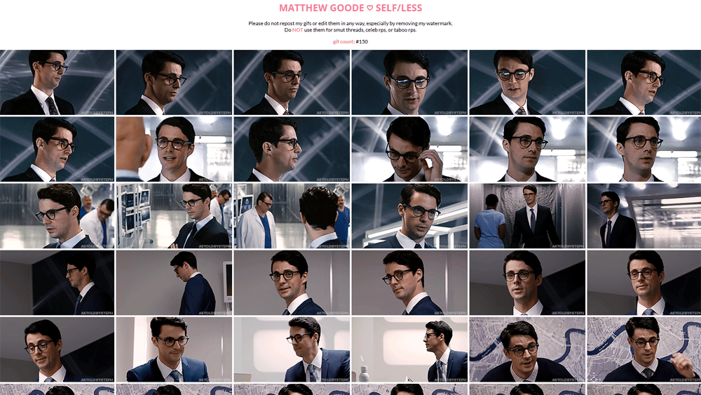 this download includes a .txt file linking to a page with #150 gifs of matthew goode in the 2015 movie, self/less. all gifs are 268 x 150.