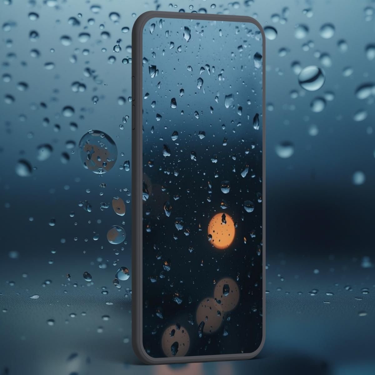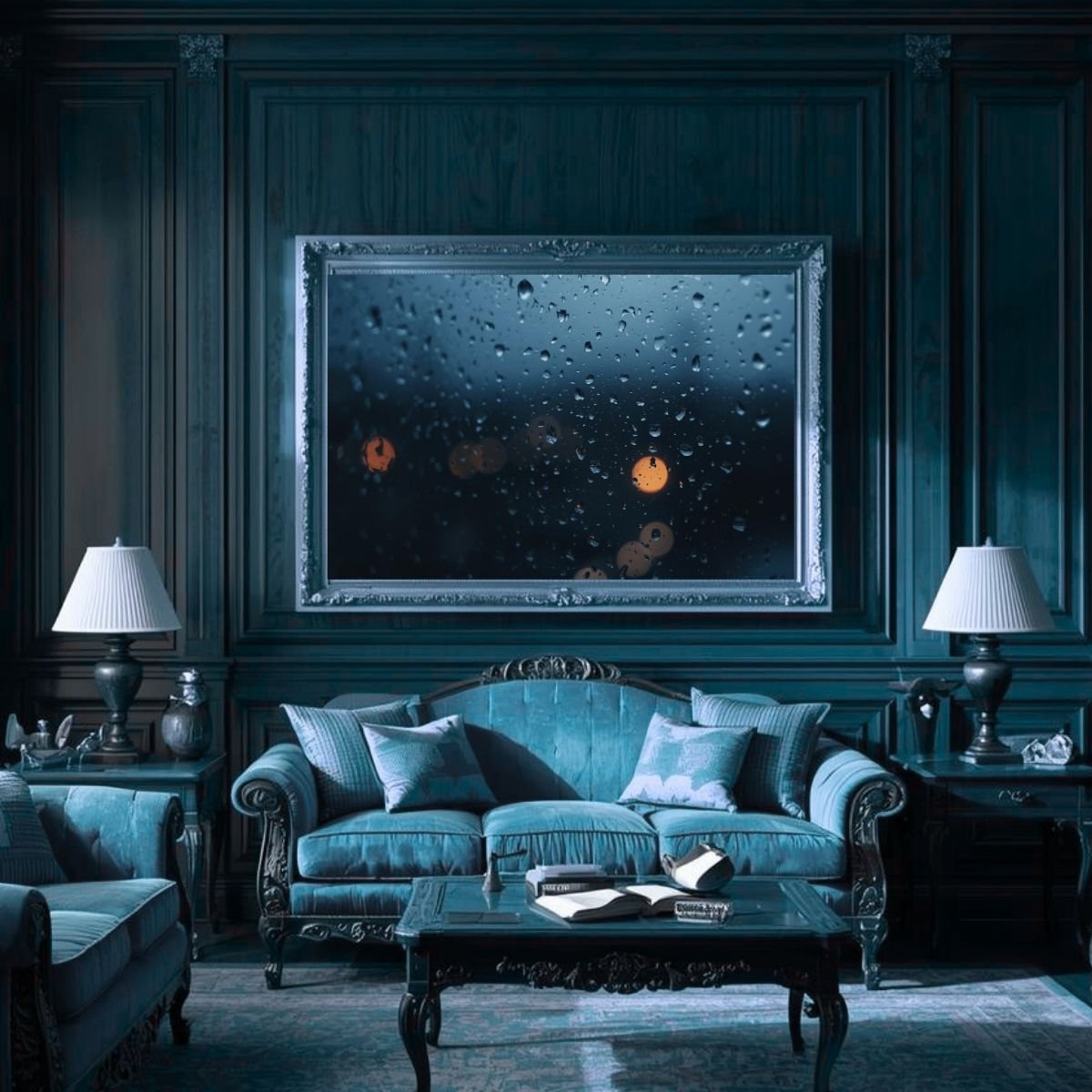 Rainfall Window captures the soothing beauty of raindrops resting against glass, with soft blurred city lights glowing gently in the distance. Deep blue and charcoal tones create an atmosphere of introspection, comfort, and peaceful reflection.