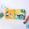 Applique made with corresponding printed fabric is embroidered on a bright yellow surface, sharp and playful.