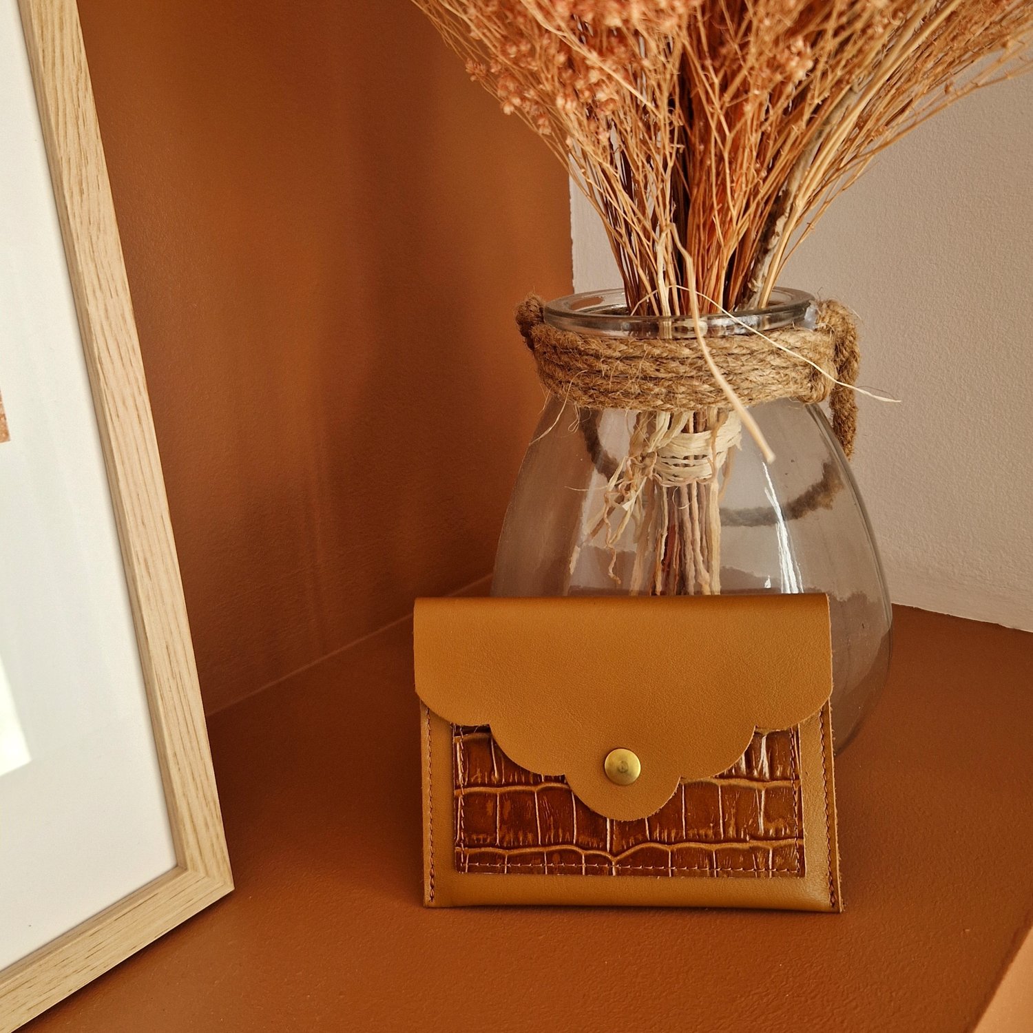 Pochette porte-monnaie/porte-cartes en cuir camel & croco