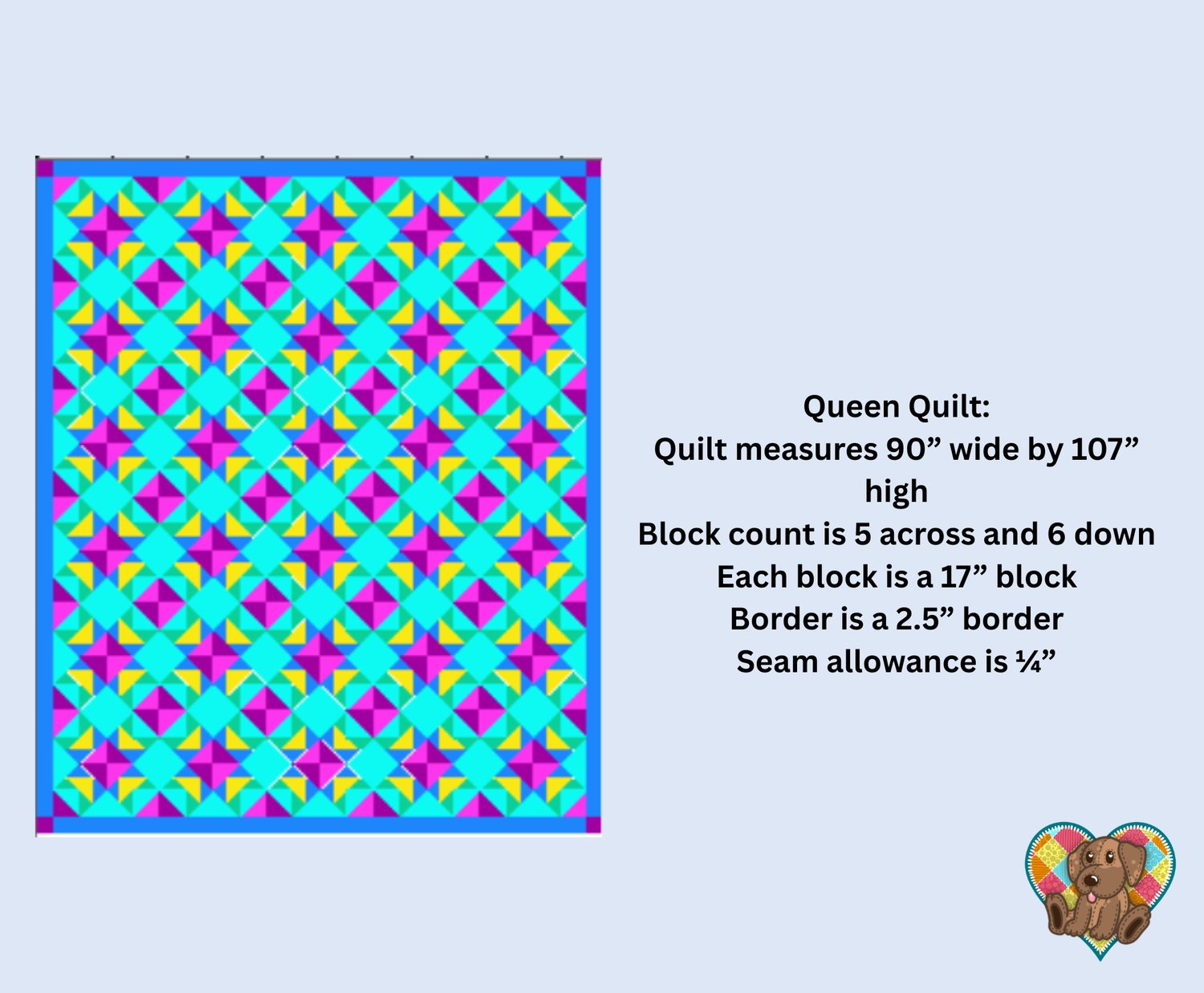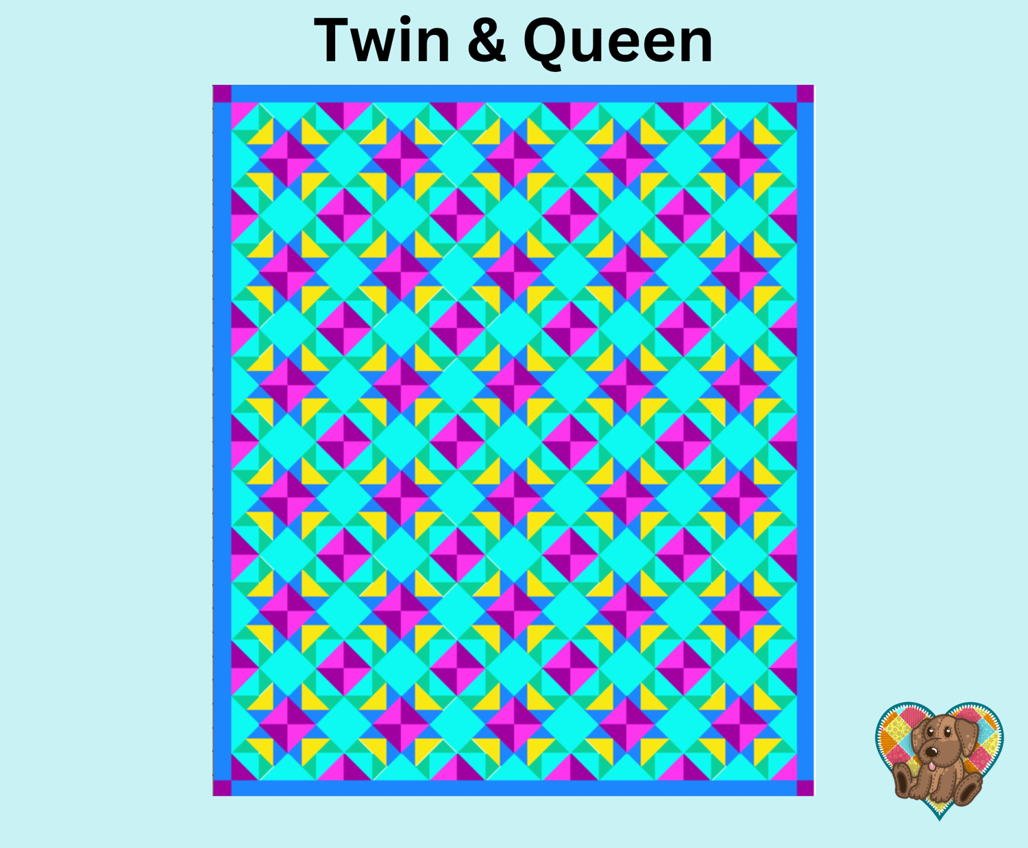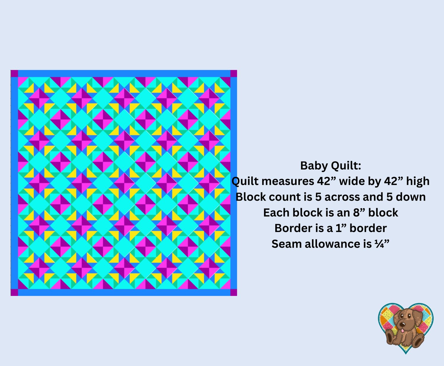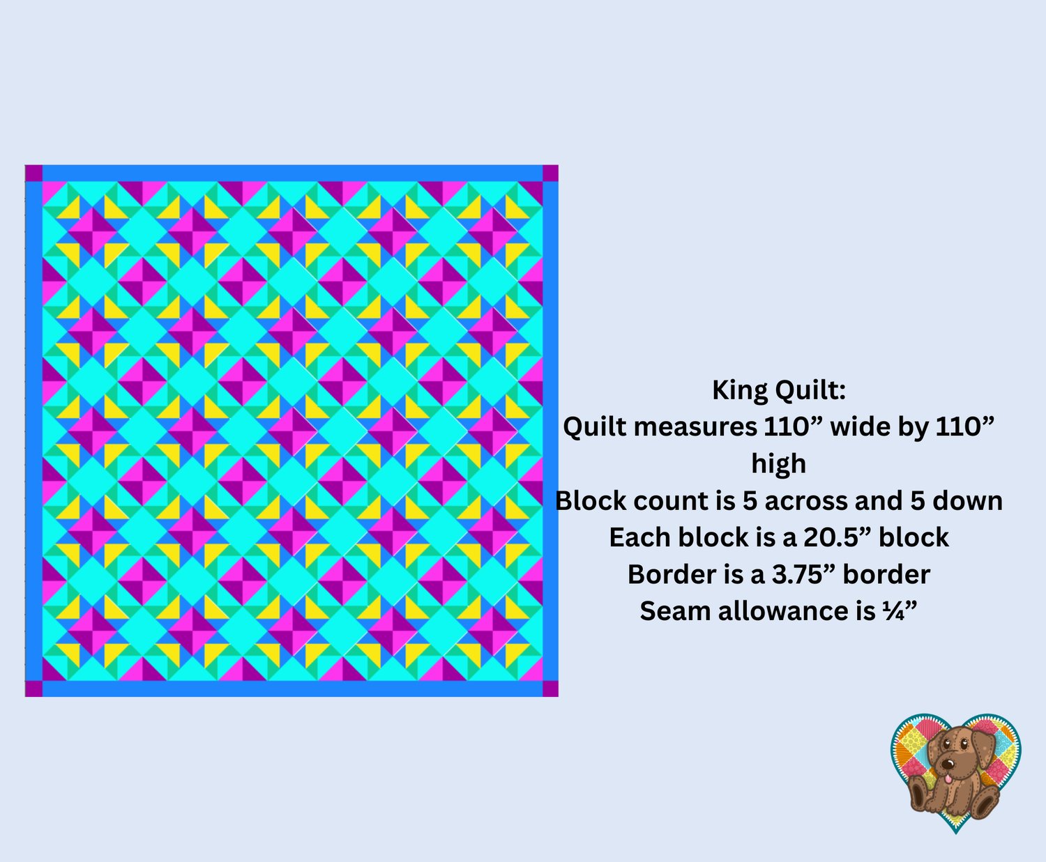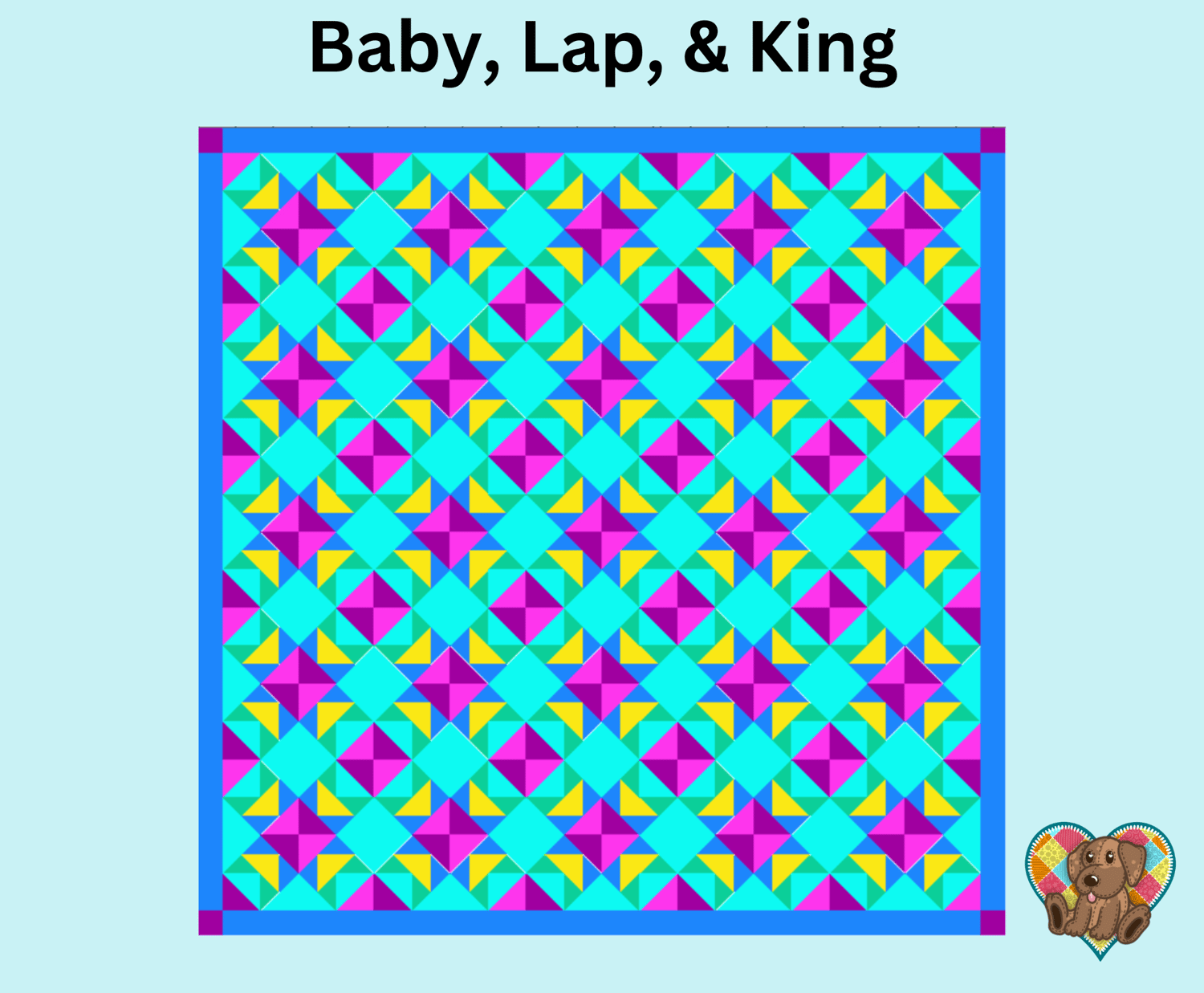 *Note: This pattern includes instructions for a baby (42" X 42"), lap (64" X 64"), twin (75.75" X 90"), queen (90" X 107"), and king (110" X 110") size quilt. * Blocks are traditional pieced blocks.