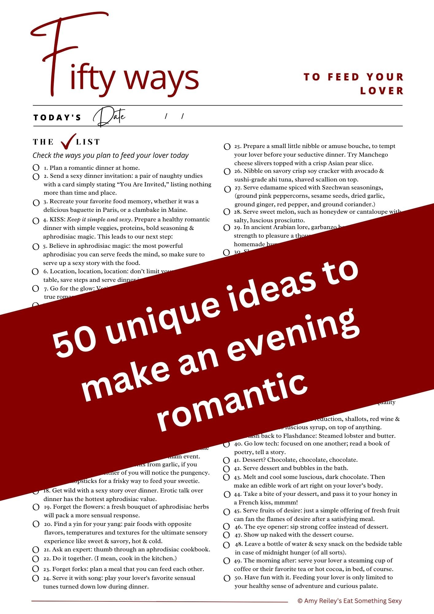 But we're giving you 50 great ideas for how to seduce and entice that special someone. Best of all, they all use food! Designed in a printable worksheet form, this guide to seduction is going to help you plan, organize and unleash romance.
