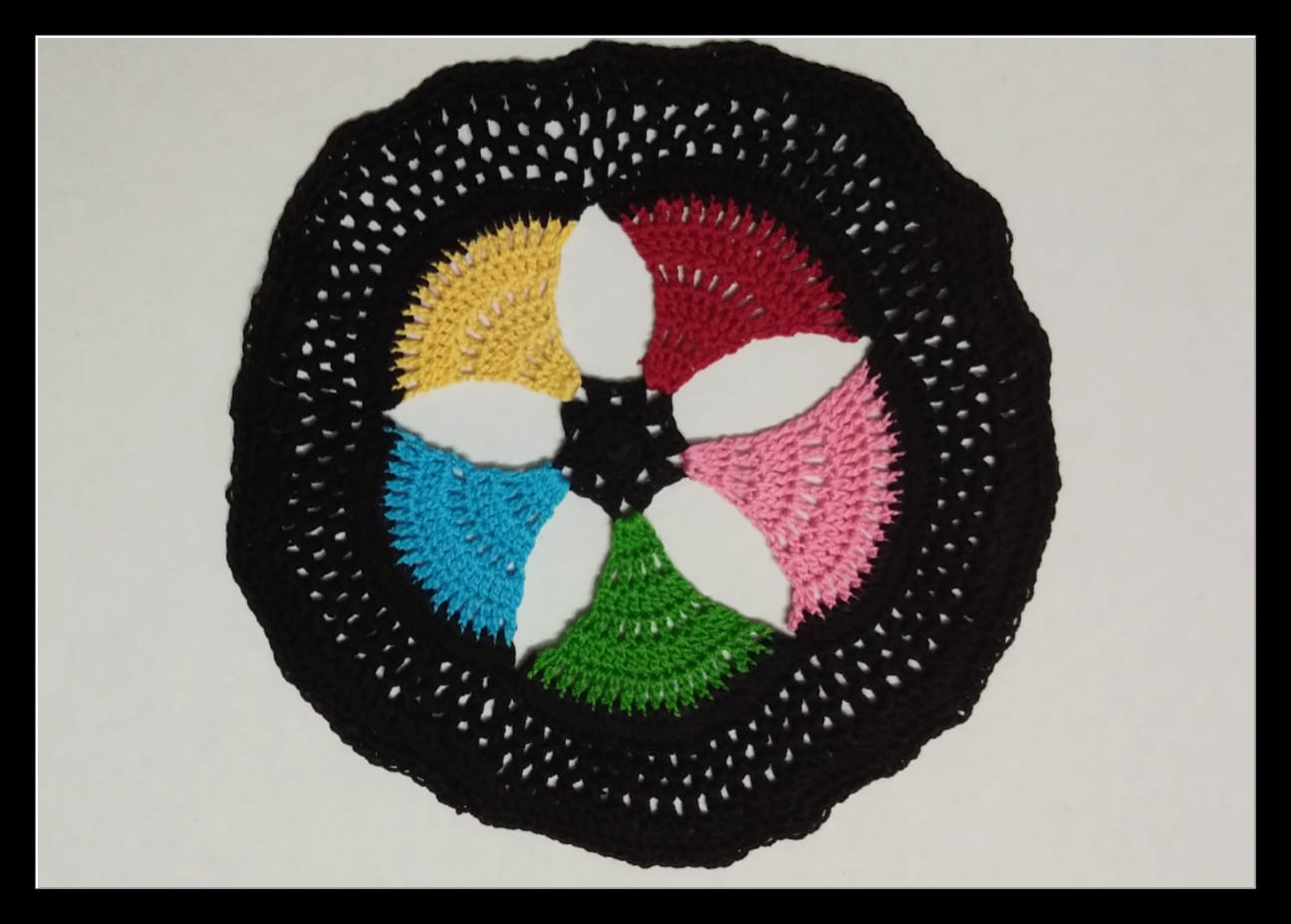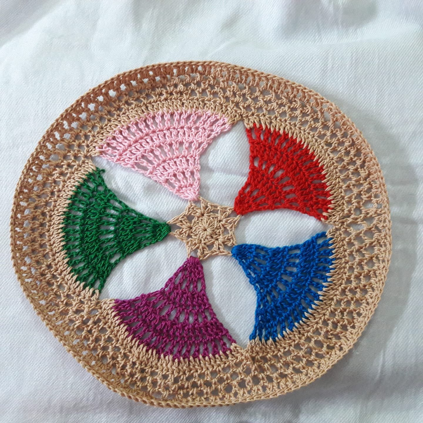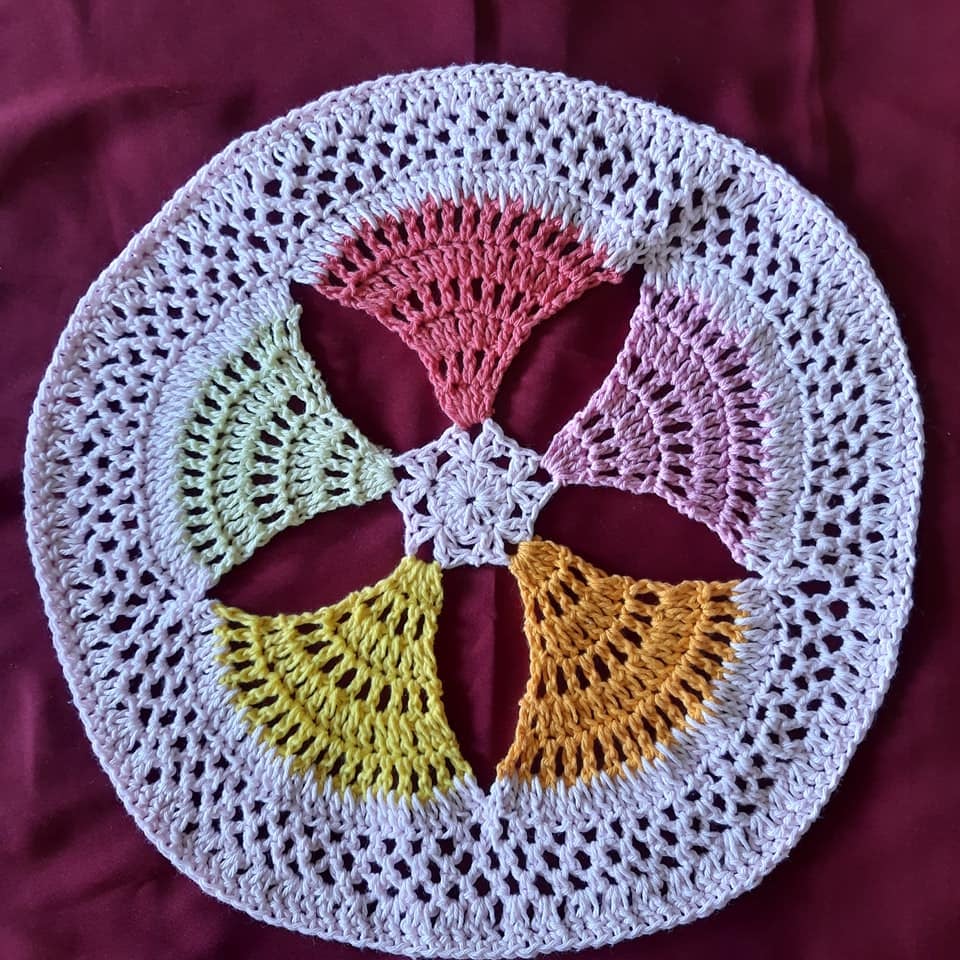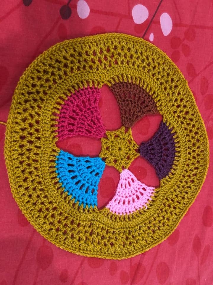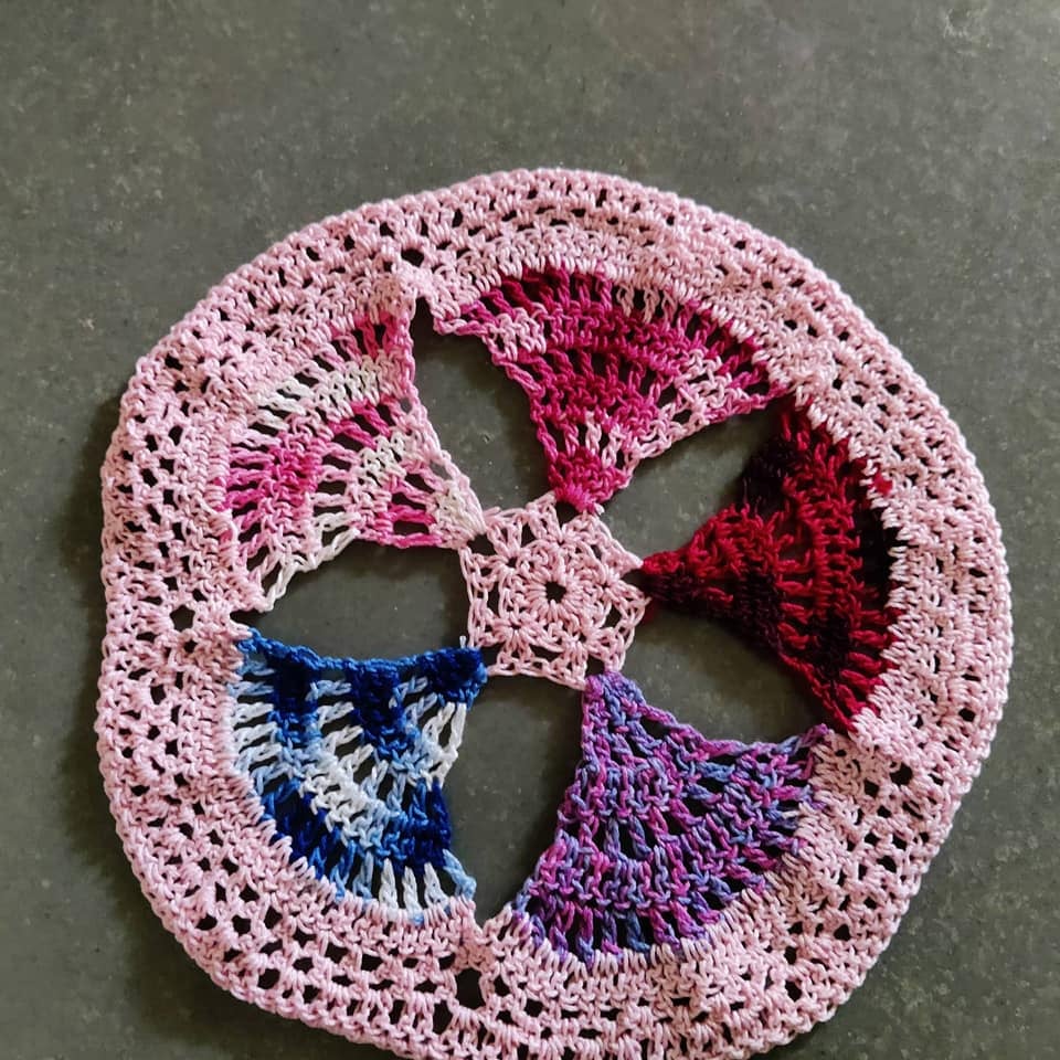 The Spring Dance Mandala is an experiment of cutting and joining new colors in sections halfway through the pattern ๐ The name came about because the fans look like skirts that are spinning in dance! We have a variety of tester versions!
