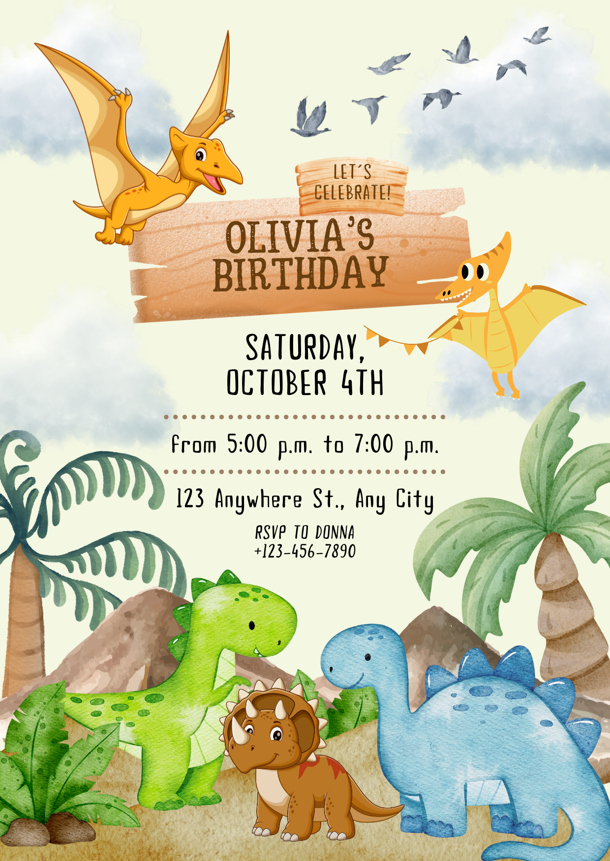 Dinosaur Birthday Invitation Template | Editable Kids Party Invite | Green & Blue Watercolor Theme