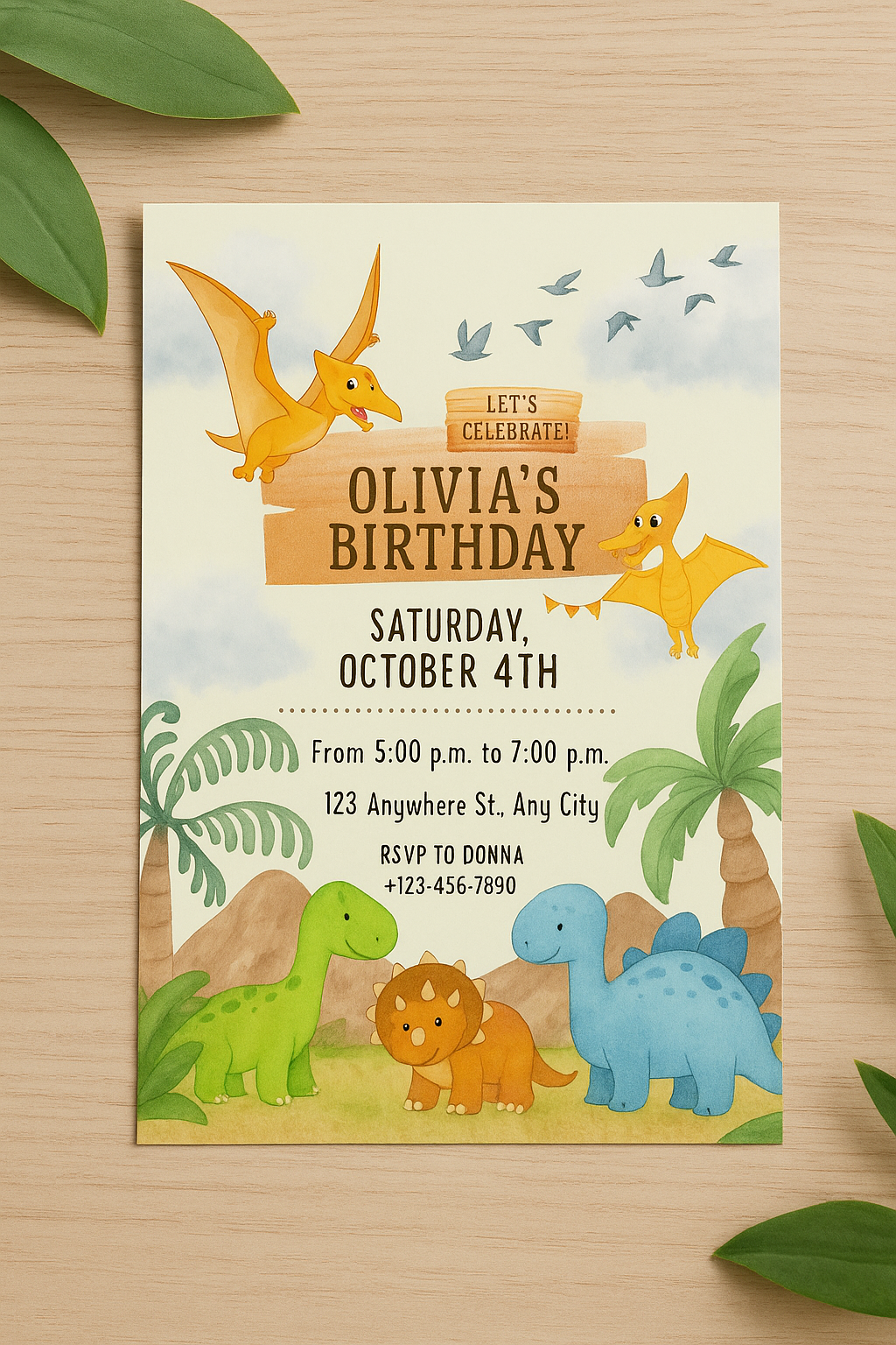 Make your child’s birthday roar-some with this adorable Watercolor Dinosaur Birthday Invitation Template! 🦖💚 Featuring playful green and blue dino illustrations, this editable invitation is perfect for boys or girls turning any age. Easily customize with your child’s name, age, party date, time, and location. Print at home or send digitally via WhatsApp, email, or social media.