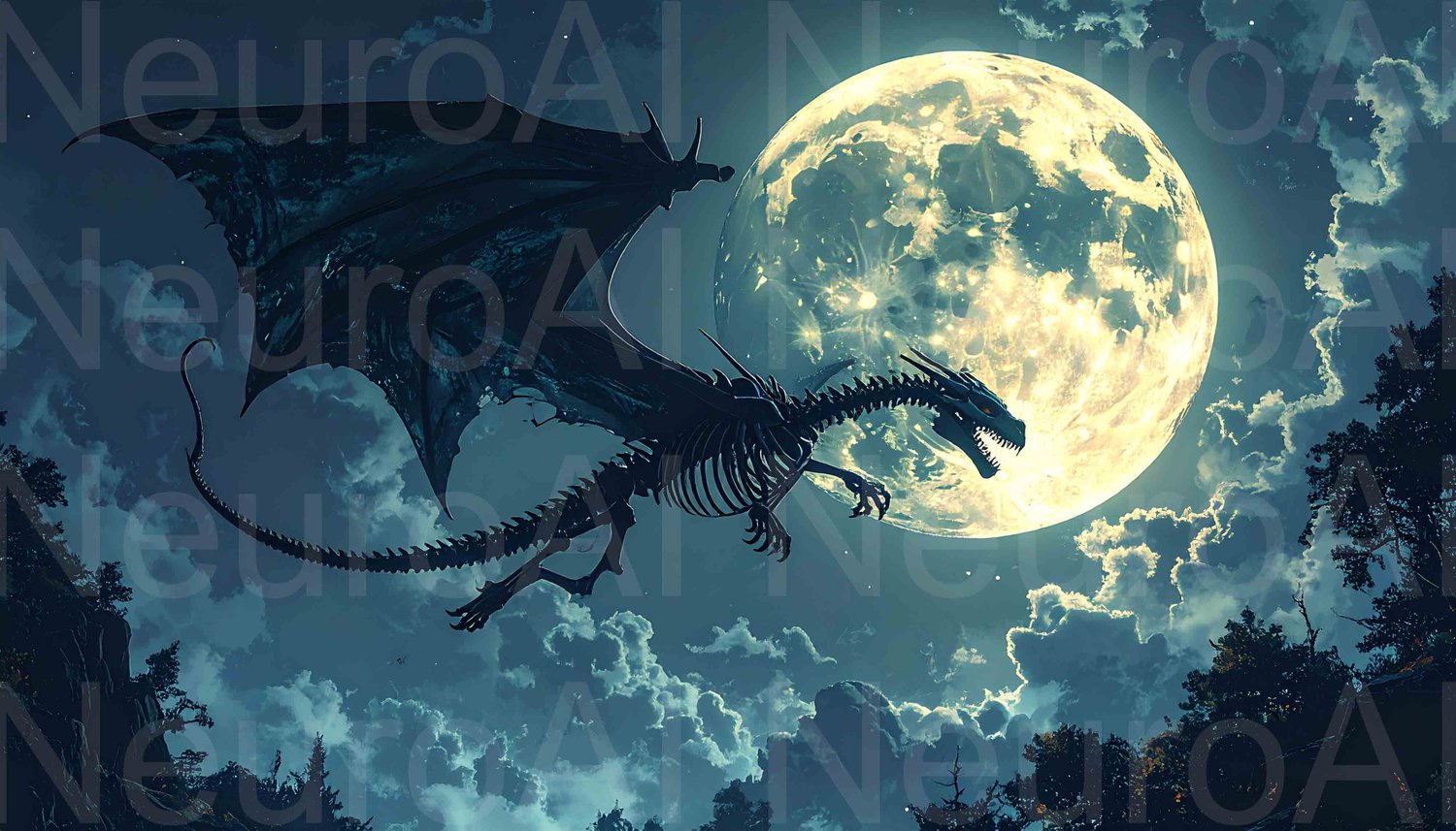 Spooky skeleton dragon flies under bright full moon