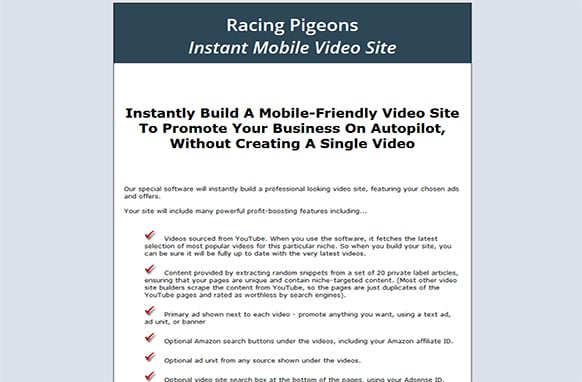 Instantly build a mobile-friendly video site all about Racing Pigeons without creating a single video. This special software will instantly build a professional-looking video site, featuring your chosen ads and offers.
