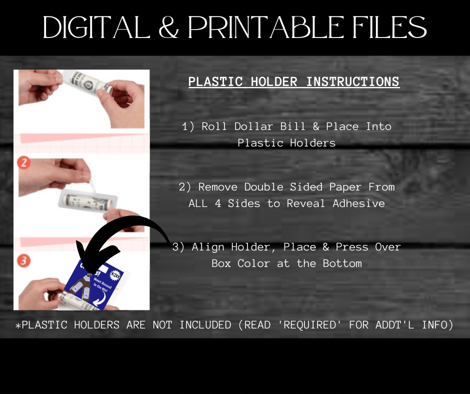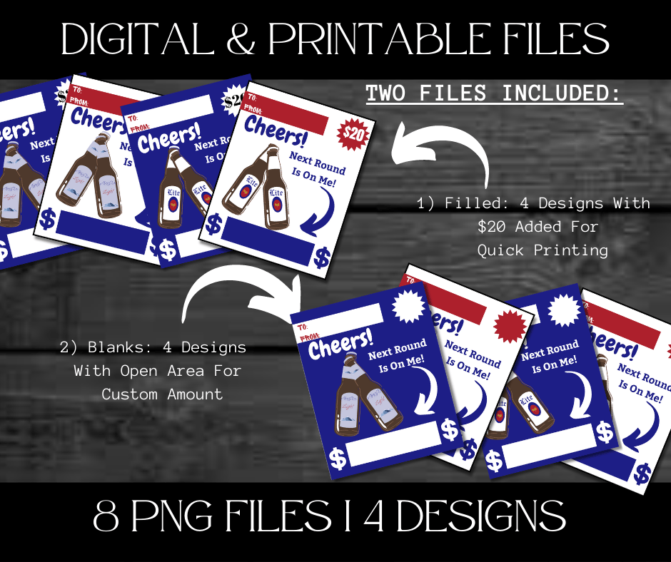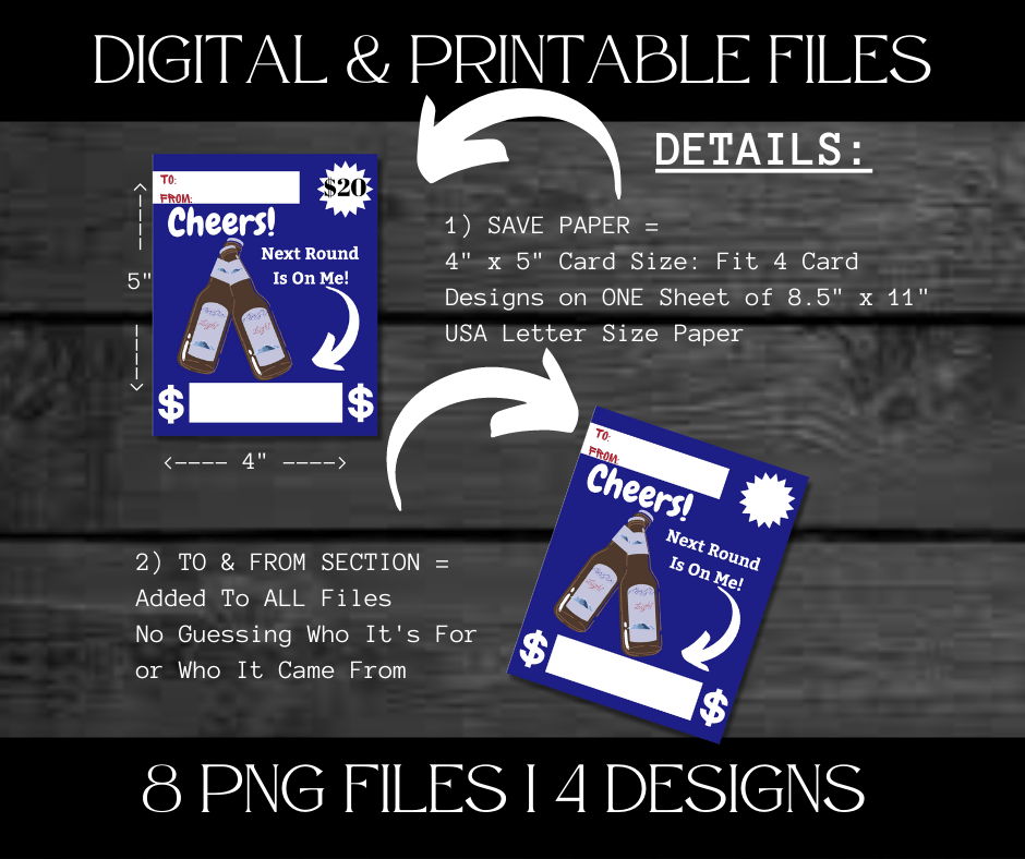 This Trendy $ Holder Cards comes in Zip Files with two PNG Folders. One Folder has Pre-Printed Amounts for Fast Printing. The other Folder has Blanks to write custom amounts. Both Folders has 4 Designs each = 8 PNG Files.