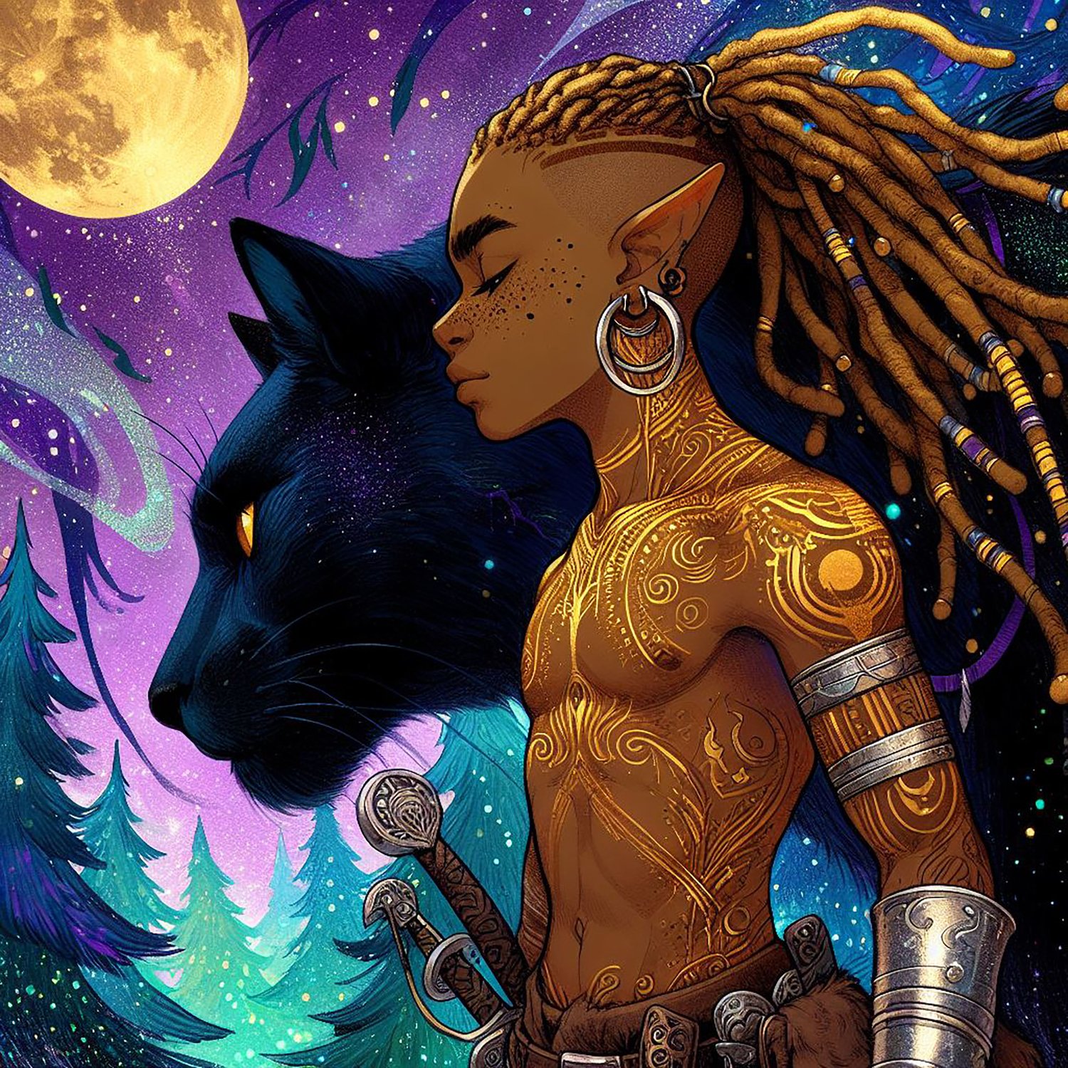 A beautiful brown boy Elf and his black panther in a misty purple forest.