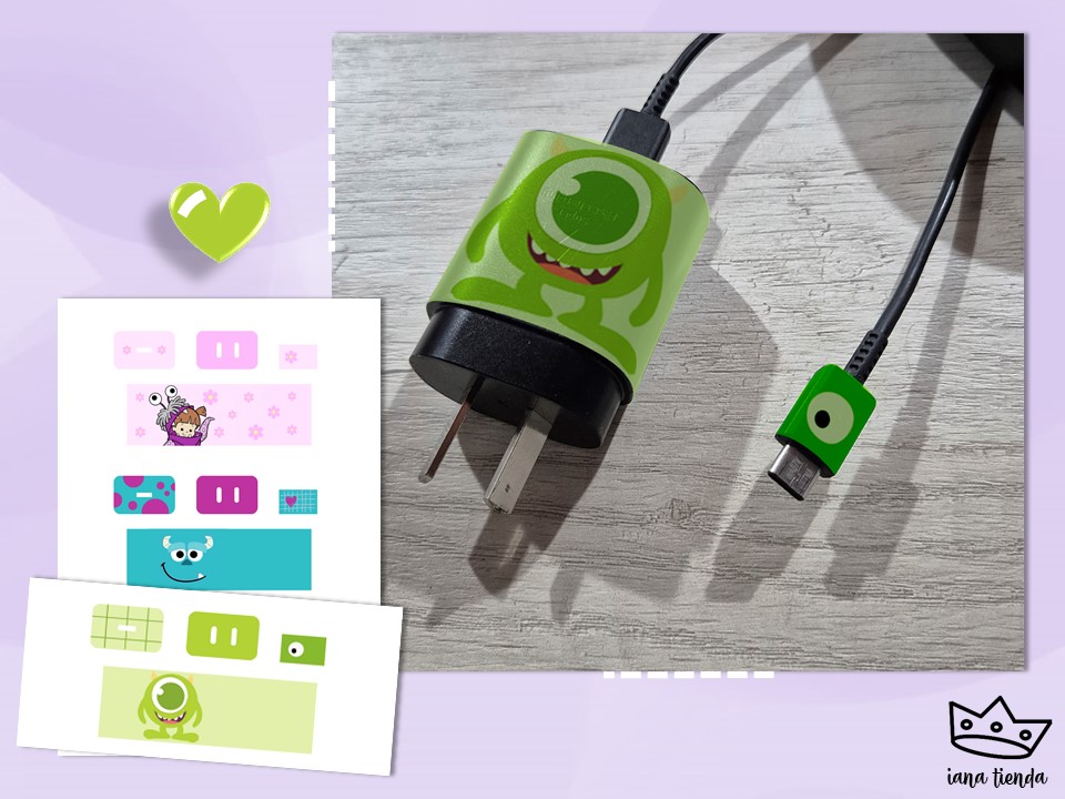 Este set incluye 3 diseños encantadores inspirados en Monsters, Inc., perfectos para personalizar cargadores de celular y darles un toque original y divertido. Ideal para fans de Mike, Sulley y Boo que quieren decorar su cargador con estilo y personalidad.