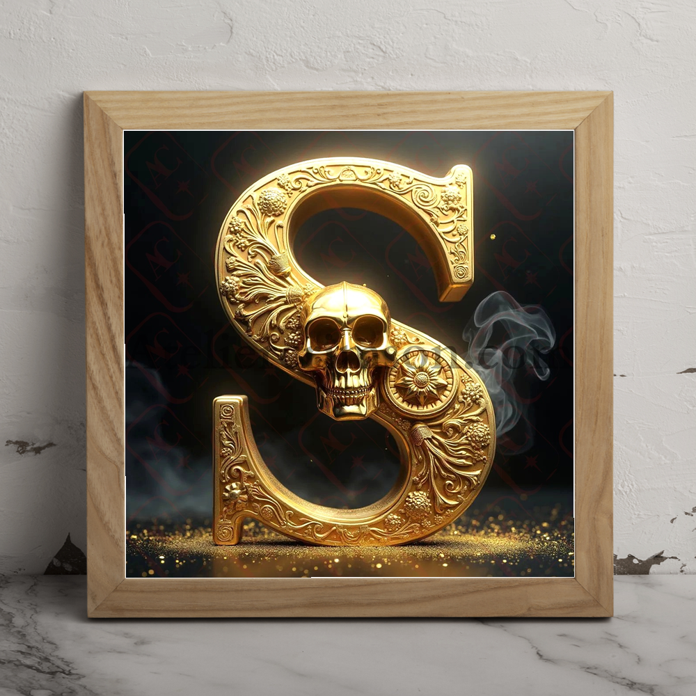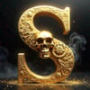 The letter S gold maya skull Skull-inspired engravings, hyper-realistic rendering. Mystical atmosphere with subtle smoke effects. Perfect for high-end typography and design projects. GoldTypography LuxuryDesign SkullArt"