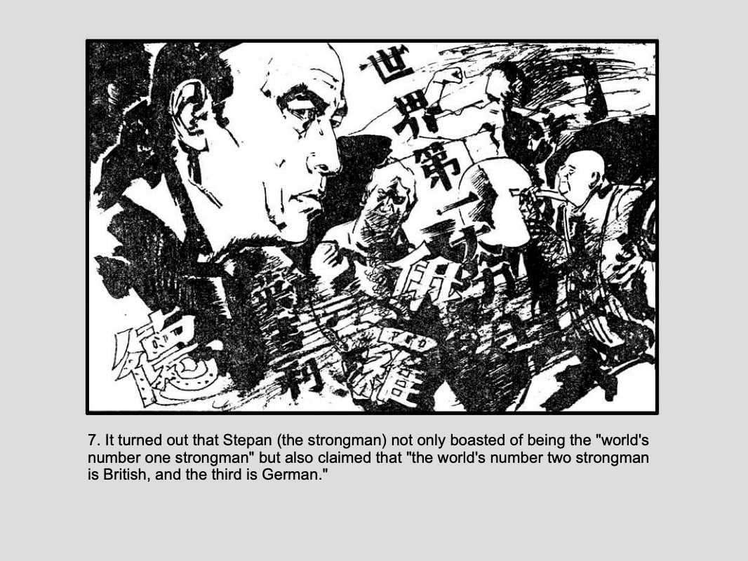 7. It turned out that Stepan (the strongman) not only boasted of being the "world's number one strongman" but also claimed that "the world's number two strongman is British, and the third is German."