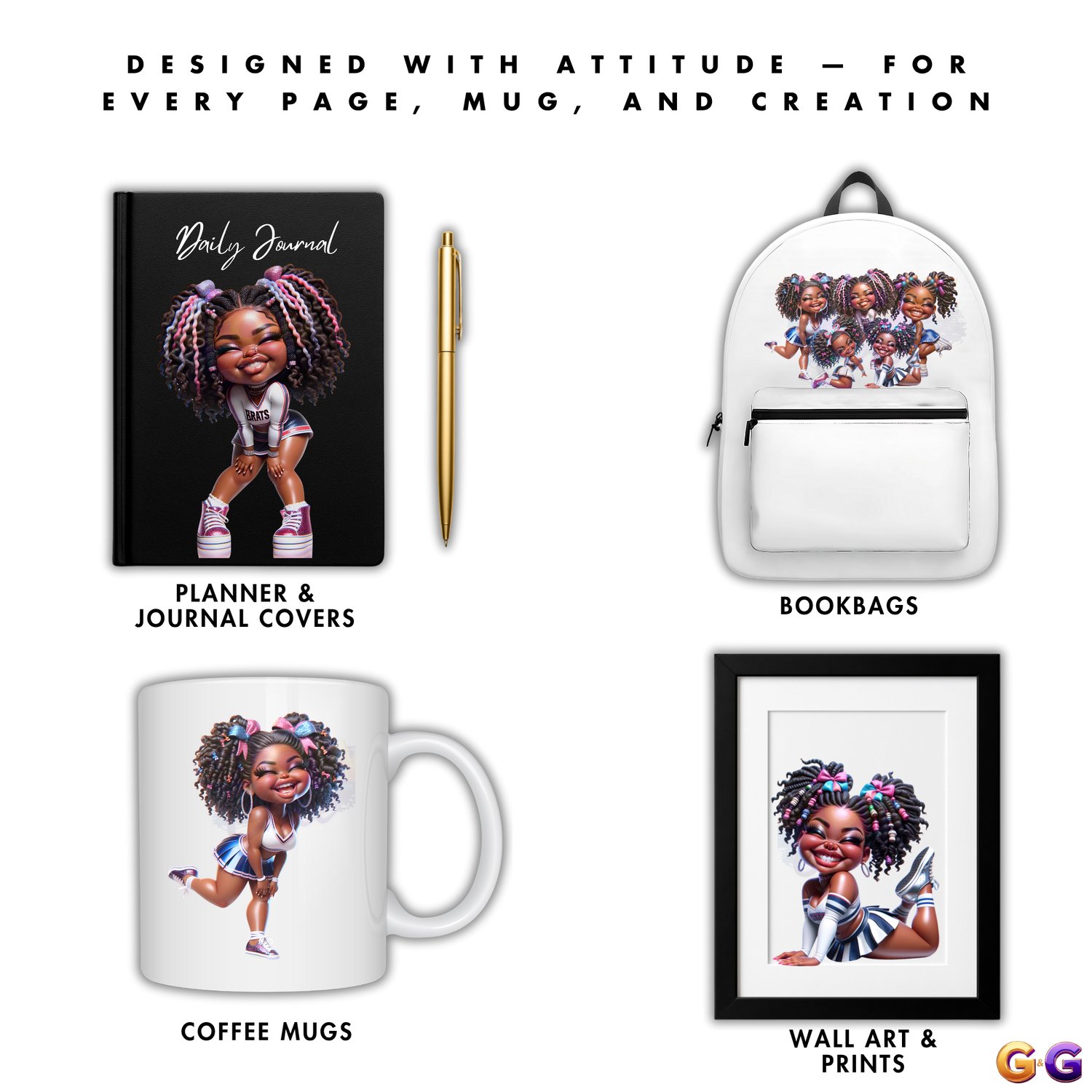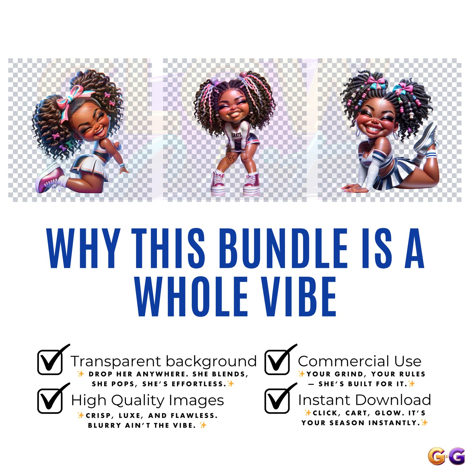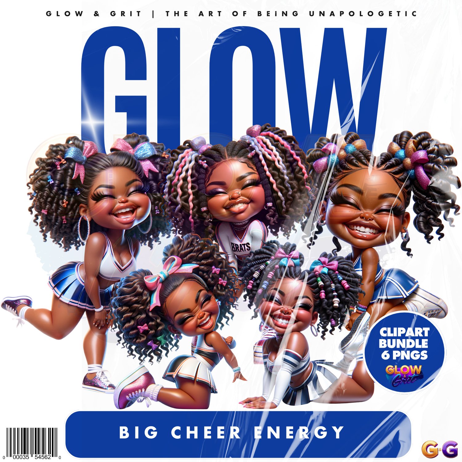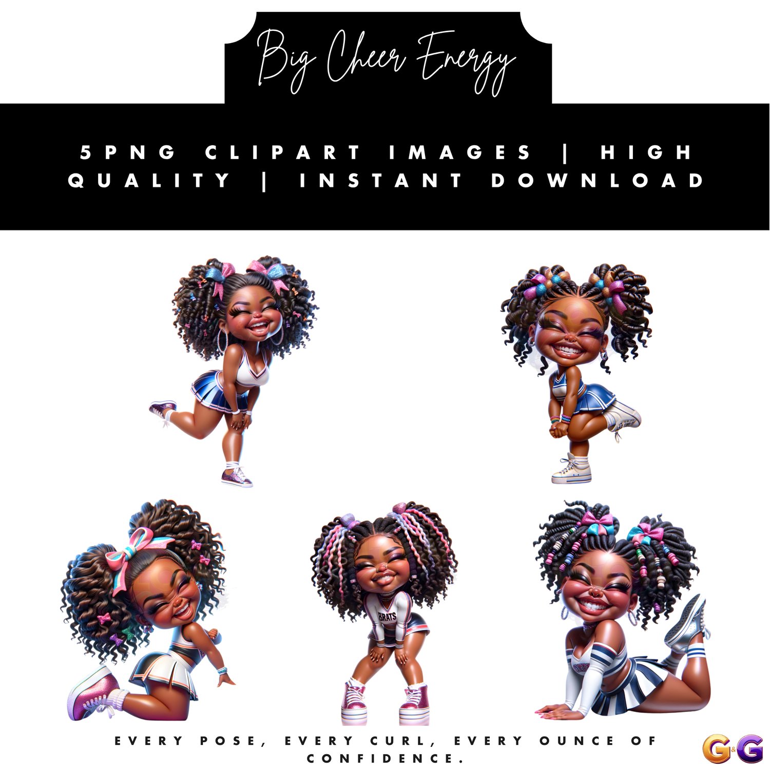 Bring on the bold with Big Cheer Energy, a celebration of joy, style, and unapologetic Black girl magic. These vibrant dolls channel pure glow — blending charm, confidence, and creativity in every pose. Whether you're designing digital planners or merch that uplifts, this set brings the sunshine to your canvas.