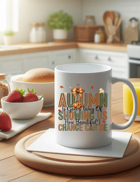 Celebrate the beauty of transformation with this custom mug by Shamrock Kustomz. Featuring the heartfelt message, "Autumn is God's Way of Showing Us How Beautiful Change Can Be," it’s perfect for cozy fall mornings with a warm drink in hand. Adorned with seasonal accents, this mug is a wonderful reminder of the blessings in every season. A meaningful gift for loved ones or an uplifting addition to your collection!