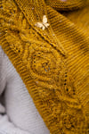 Calla Lily is an elegant cabled wrap, inspired by Art Deco fashion, which flourished in the 1930s and earlier. In madcap comedies like Bringing Up Baby, elegant accessories reigned, whether the characters were larking it up on the golf course or traipsing around the countryside. Wear it draped over one shoulder Katharine Hepburn-style or clasped around the neck.