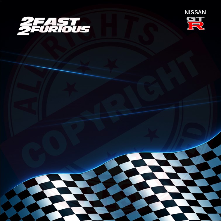 Ce nouveau design est inspiré de 2 Fast 2 Furious, avec une ambiance encore plus racing : fond sombre, reflets bleus stylisés et drapeau à damier pour un rendu percutant et dynamique. Il met en valeur la voiture dans un esprit à la fois élégant et nerveux.