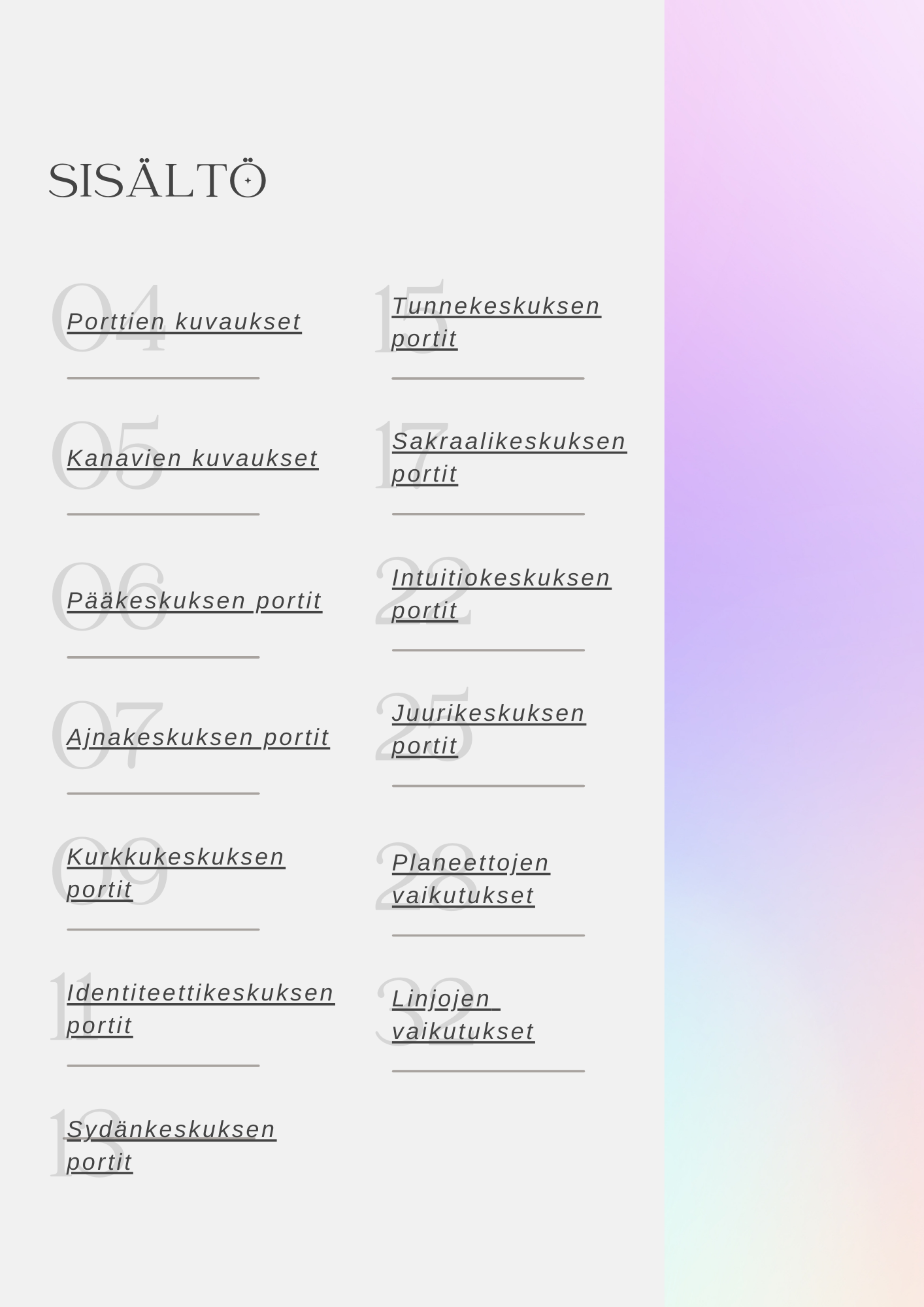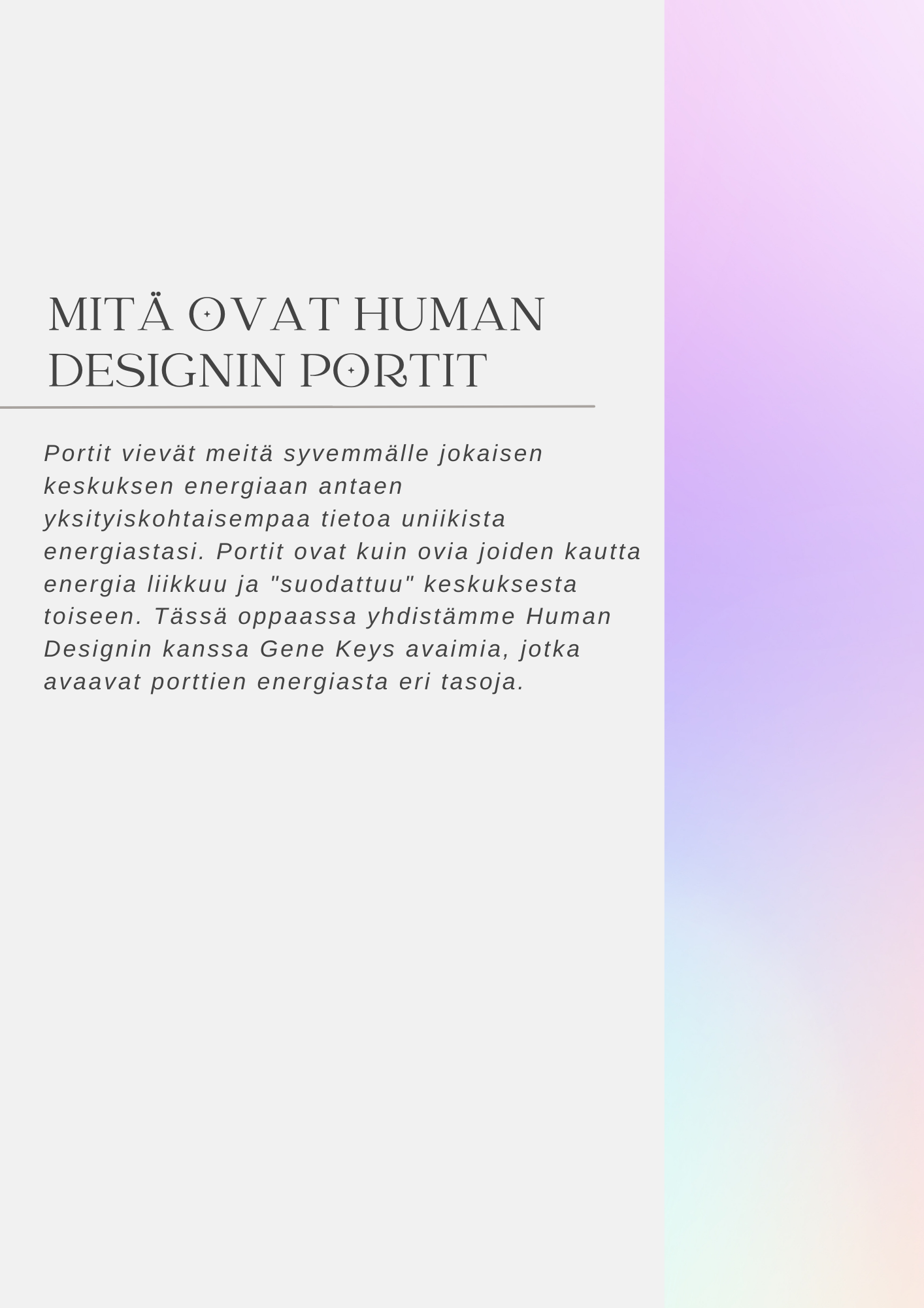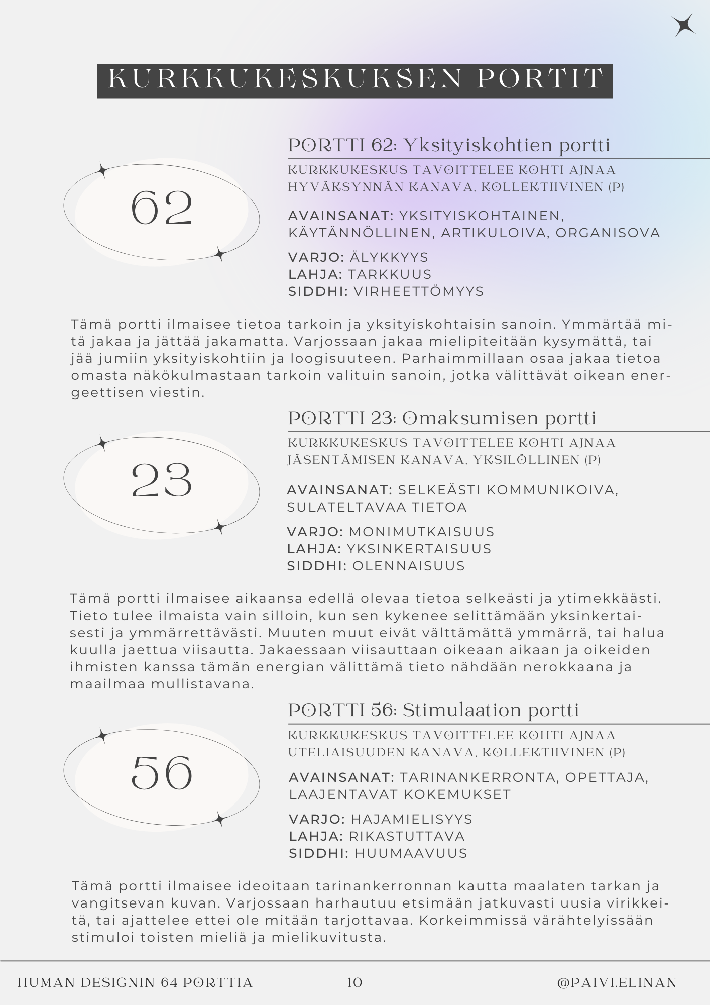 Tästä oppaasta löydät kaikki Human Designin 64 porttia avattuna merkityksineen, lahjoineen ja varjoineen. Oppaasta löydät myös linjojen ja planeettojen merkitykset. Ostaessasi oppaan saat jatkossa kaikki siihen tulevat päivityksen (kuten työn alla olevat Human Designin kanavat).