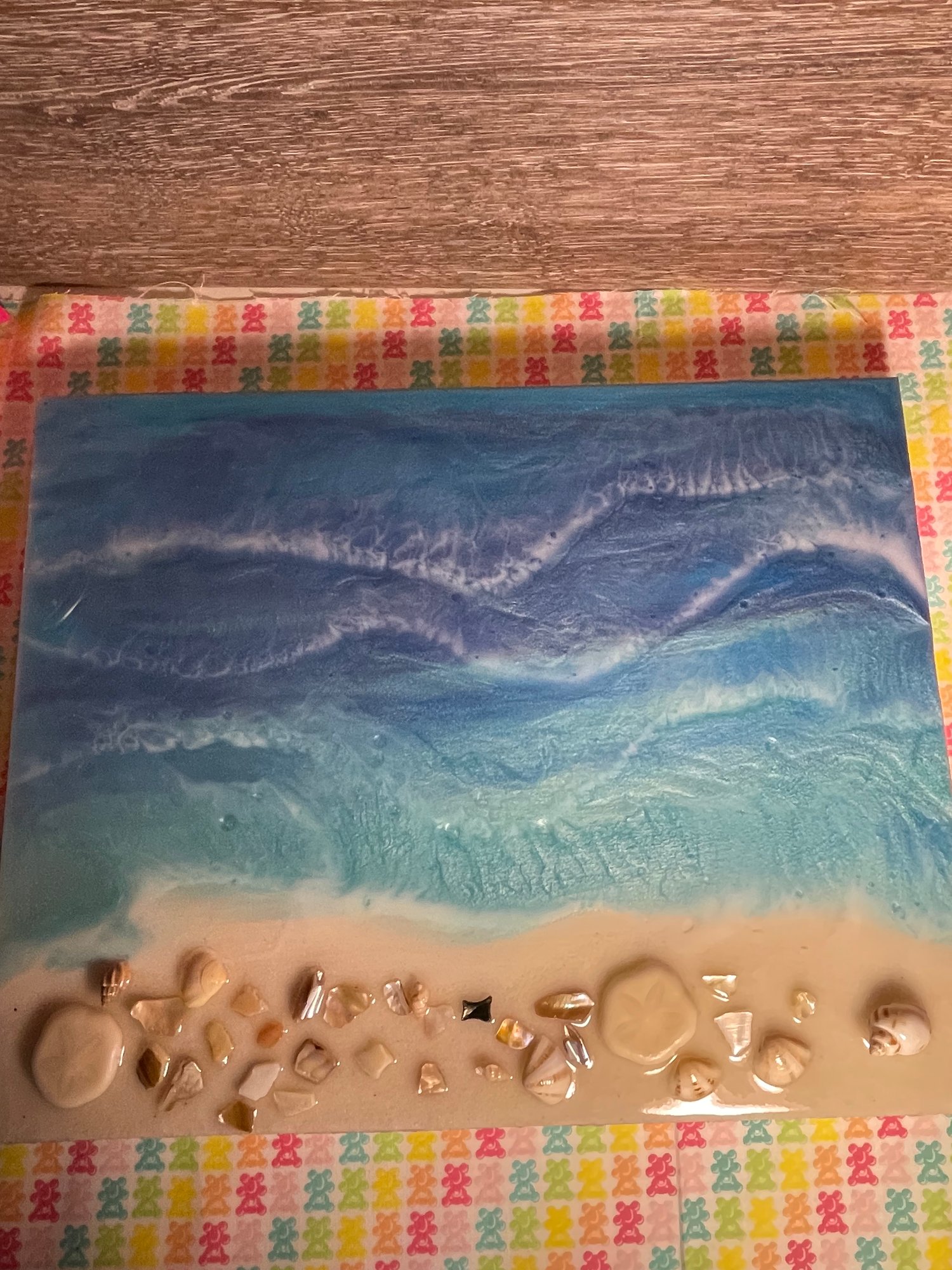 This stunning epoxy wall art captures the serene beauty of the ocean, measuring 11 x 14 inches, set against a rustic piece of wood. The translucent blues and greens of the epoxy paint a vivid tableau of waves meeting the shore, evoking a sense of tranquility and seaside nostalgia. Adding a tactile dimension, real sand is meticulously layered, offering a tangible texture that mimics the coastal shores. Interspersed within the watery expanse, genuine seashells are delicately embedded, lending an authentic touch of marine life. Together, these elements coalesce to create a mesmerizing composition that brings the essence of the ocean into any space, making it a captivating centerpiece for admirers of coastal aesthetics.