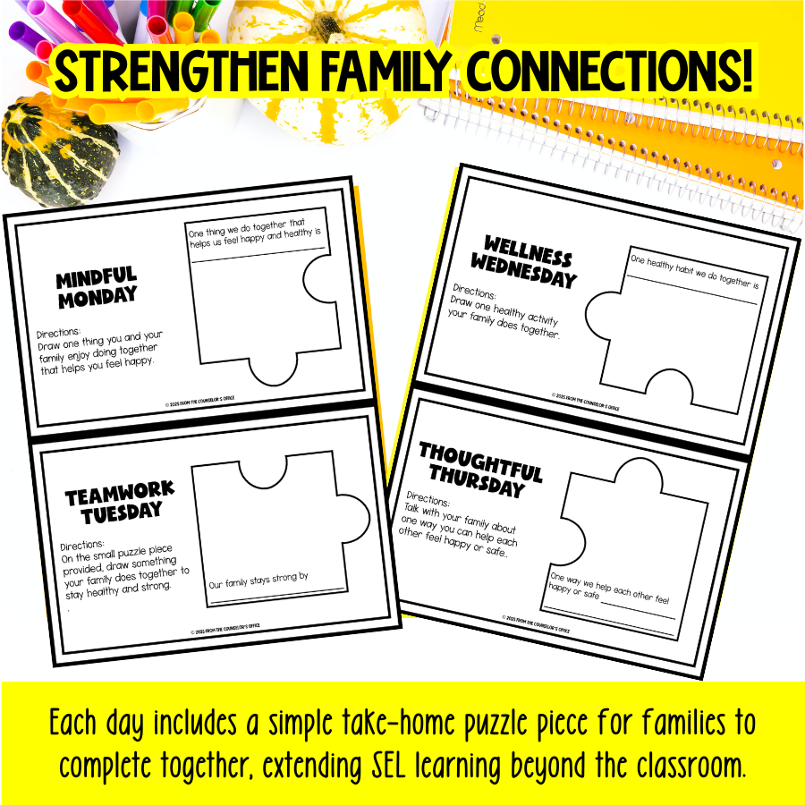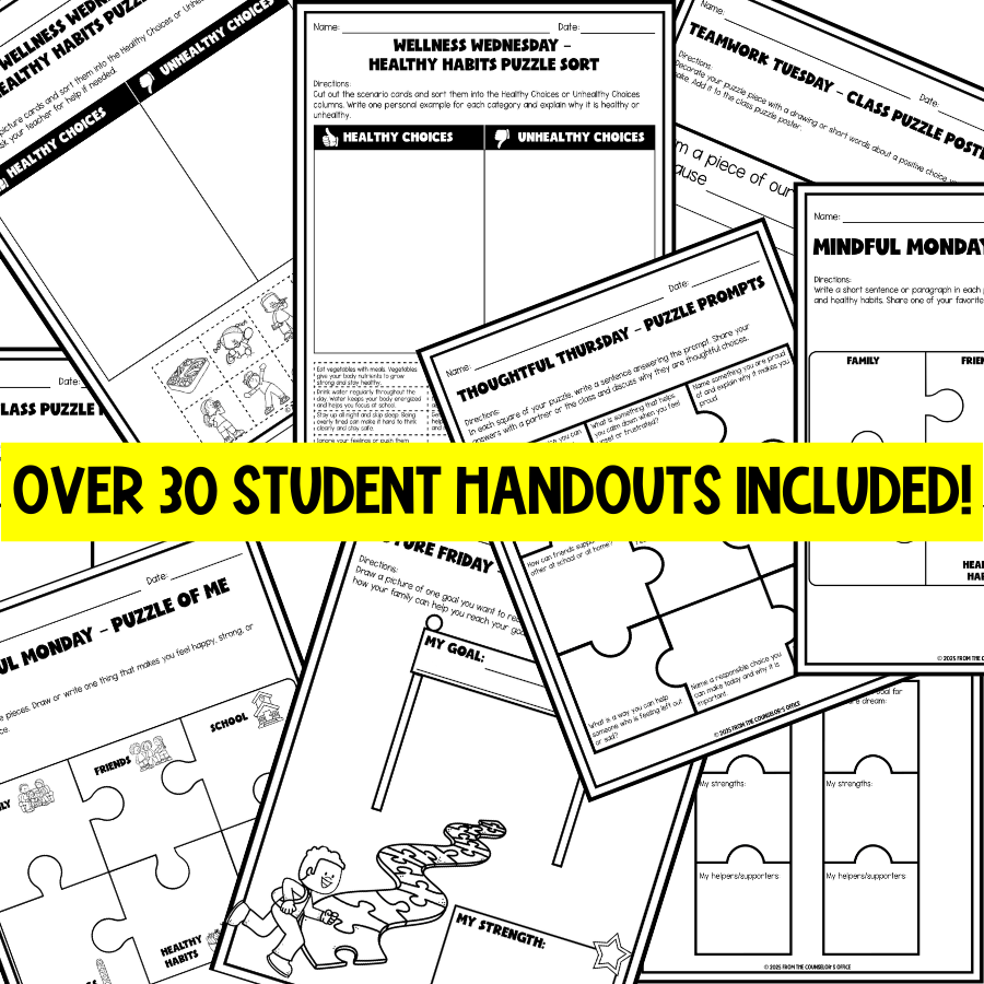 Every activity is print-and-go with clear student and family directions, making it simple to implement during a themed week or as stand-alone SEL lessons. The puzzle theme adds a fun, visual element that students love and that makes bulletin board displays easy to create.