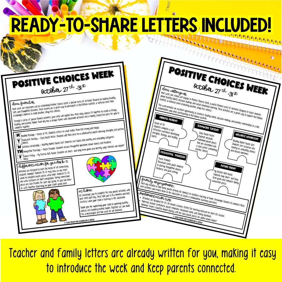 This resource helps students explore positive choices and personal strengths while reinforcing social-emotional learning skills like decision-making, goal setting, and self-awareness. The daily activities fit together like puzzle pieces to create a week of meaningful reflection, collaboration, and family engagement. It’s also a perfect fit for schools looking for engaging ways to participate in Red Ribbon Week®, the national event that encourages drug-free, healthy living.