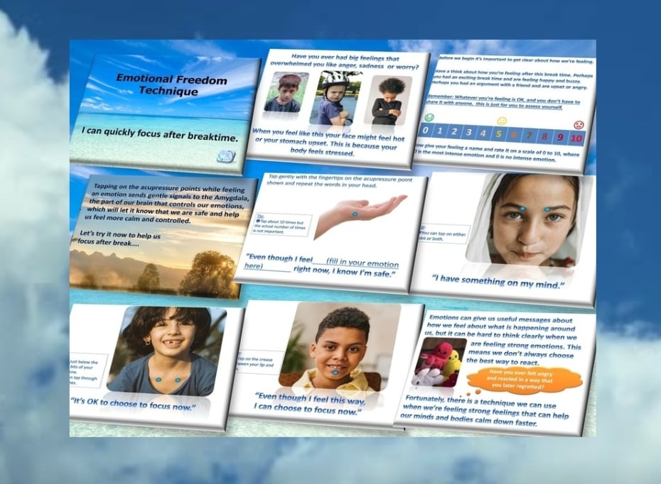 * An editable 28 slide PowerPoint introduction and guided emotional regulation exercise to use after break or lunchtime, to help children quickly feel calm and focused. This can be used with no previous EFT knowledge as it explains the key principles of the technique and then guides you through two rounds of tapping with on-screen prompts and tips and includes teaching notes.