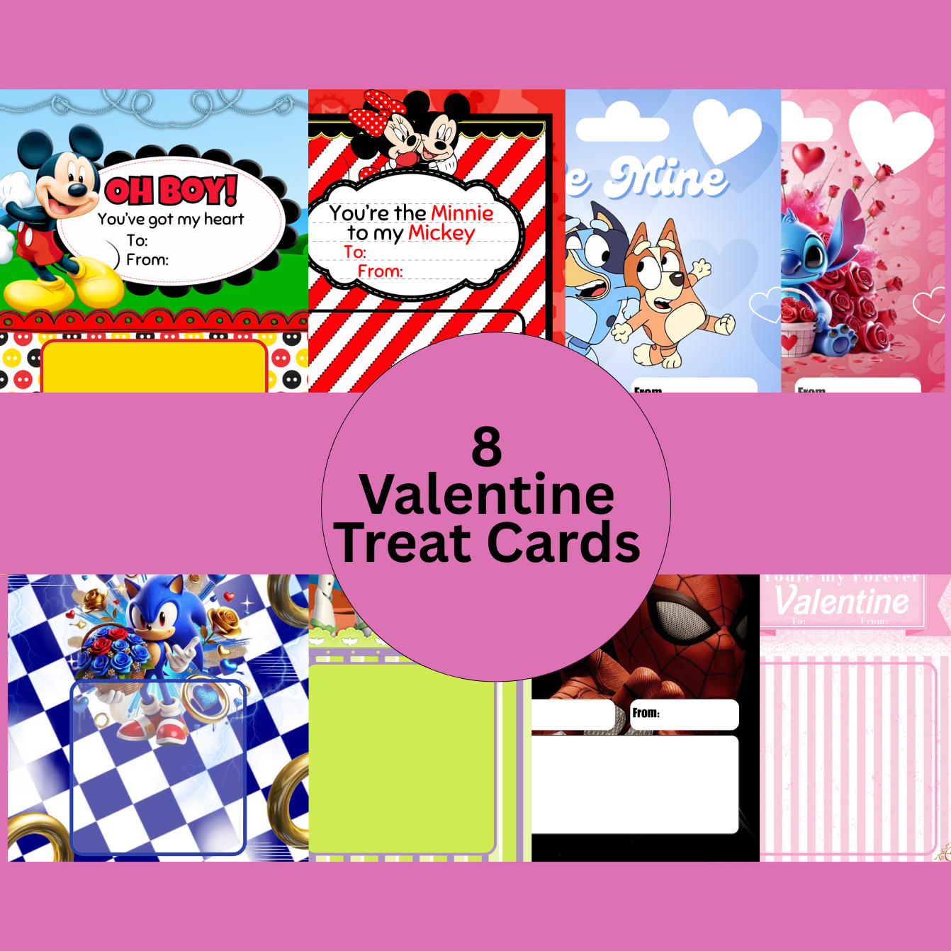 Make classroom gifting, party favors, and boutique bundles pop with this playful set of 8 Valentine Treat Cards! Each card features a beloved character and a sweet message, designed to spark smiles and celebrate love in every style. With editable “To” and “From” fields, these cards are perfect for personalizing your Valentine’s Day handouts or adding flair to your seasonal product lineup.
