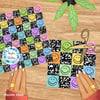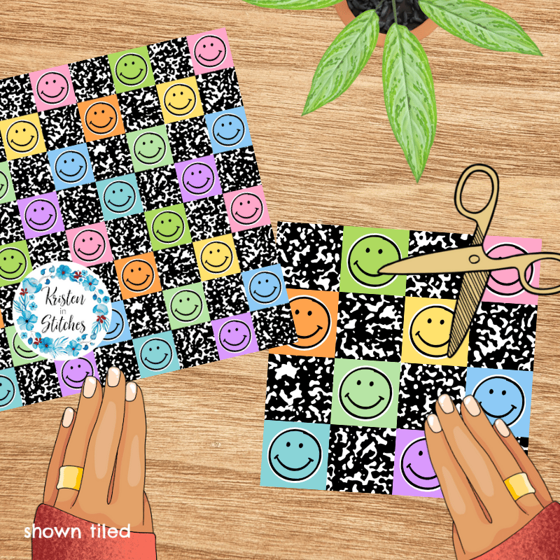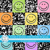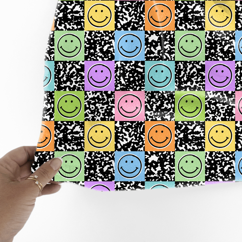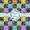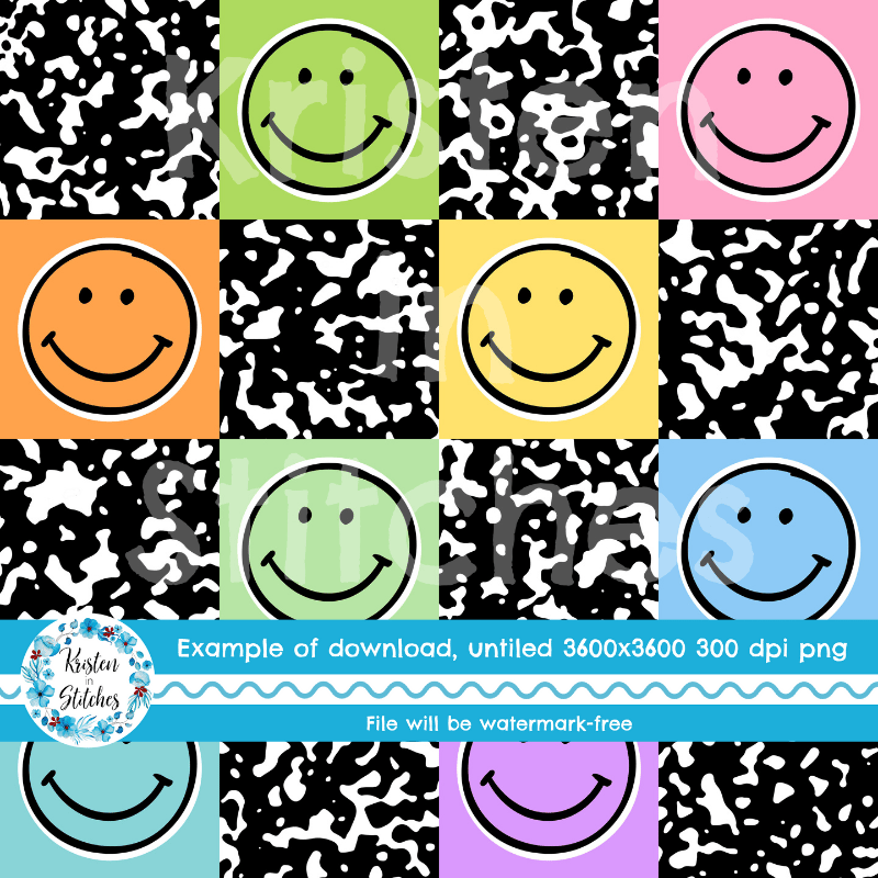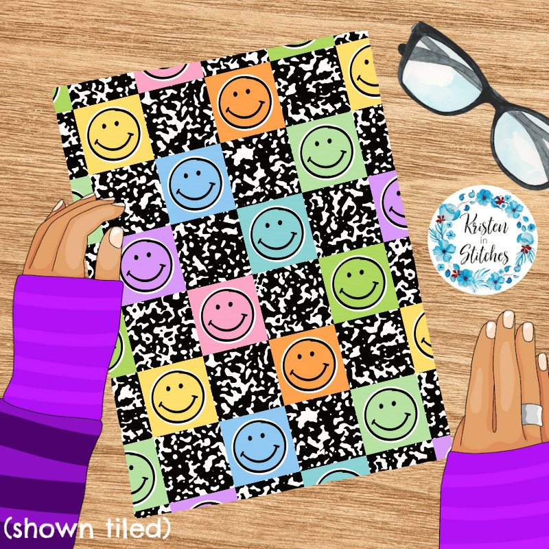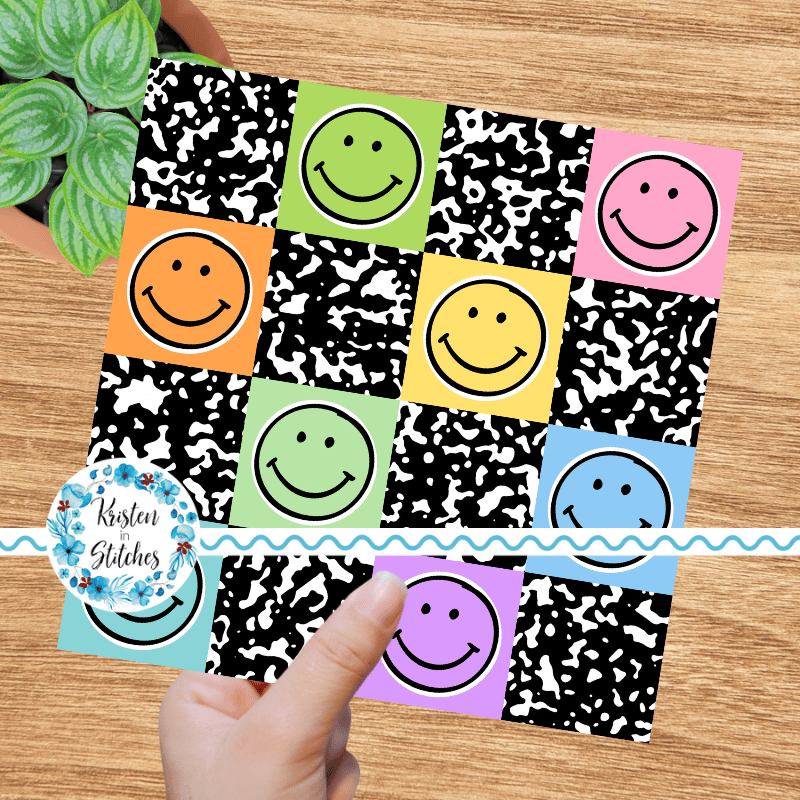 Colorful happy smiley faces with black composition notebook texture.