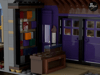 On the ground floor of the travel agency Globus Mundi you will find its "salesroom" including a globe, three clocks for the different time zones, a world map (sticker) and a brochure (sticker) for a vacation in Romania. There is also a small Statue of Liberty as decoration. The windows are covered by ads.