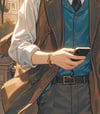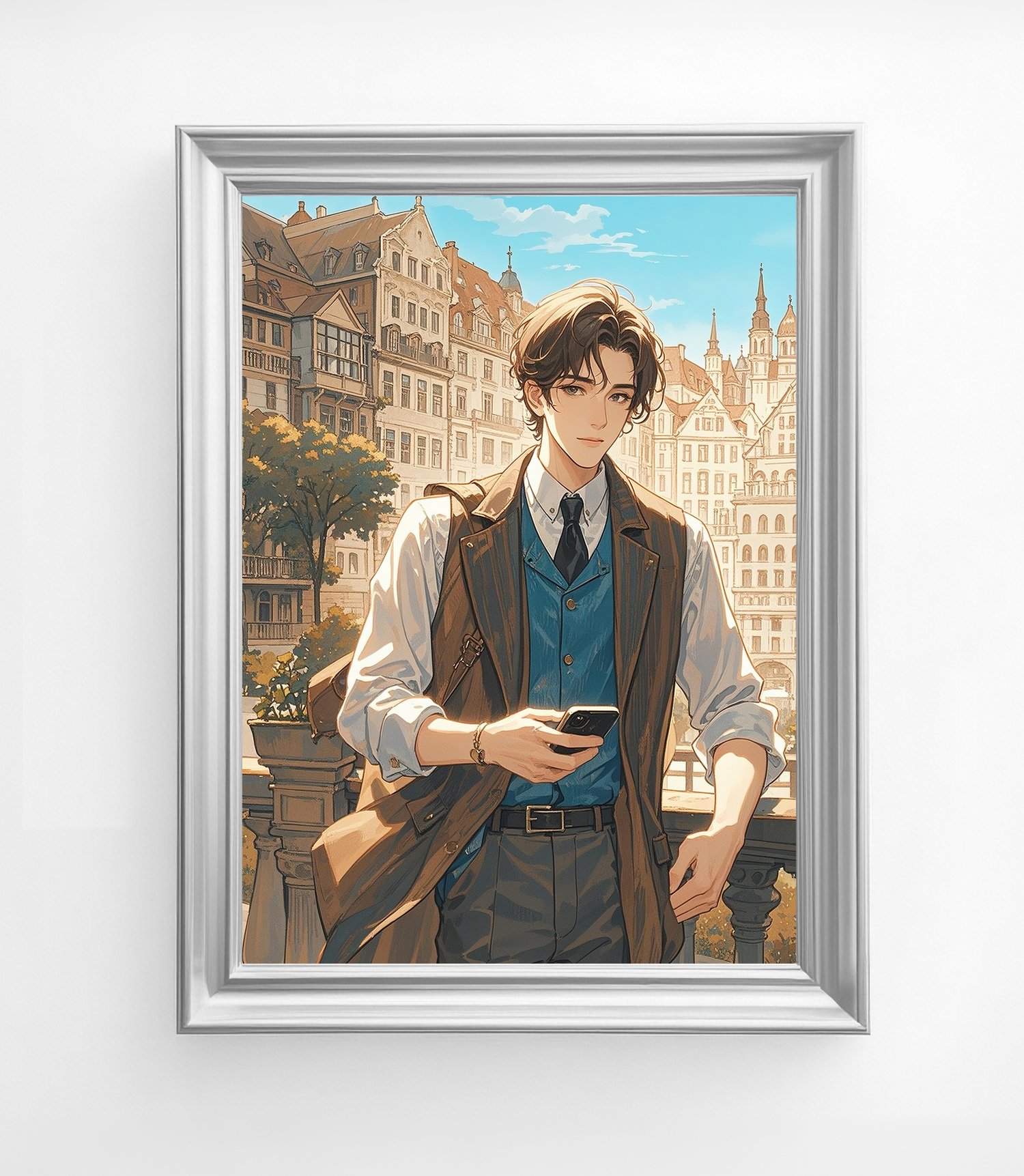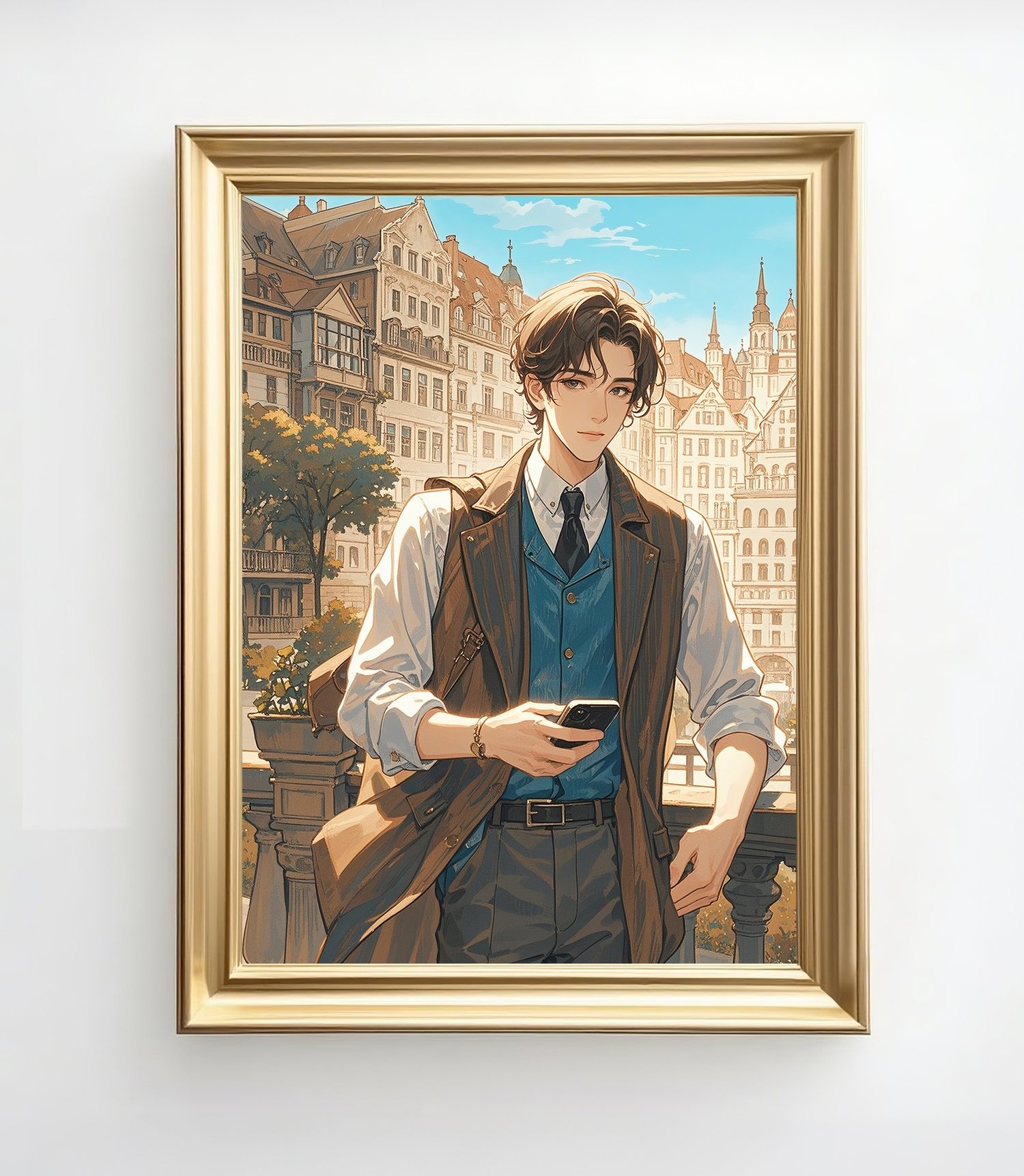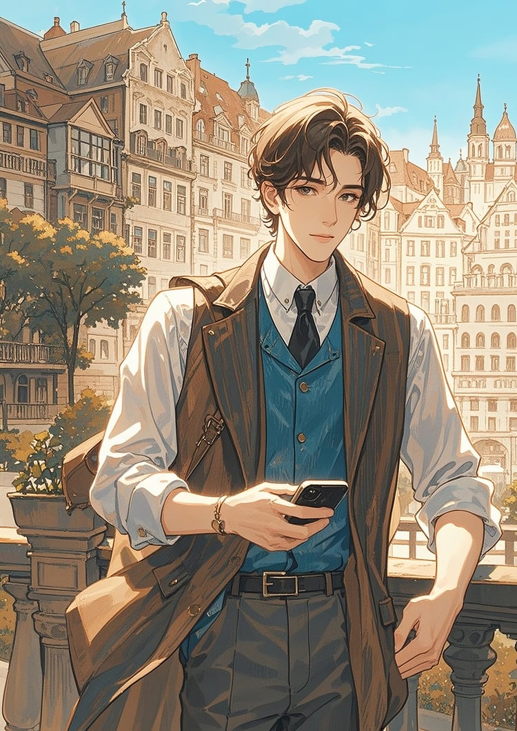 This artwork beautifully combines a sense of timeless elegance with modern elements. The European-style architecture in the background is rendered with intricate details and warm tones, creating a serene and inviting atmosphere. In contrast, the man in the foreground, dressed in contemporary attire and holding a smartphone, bridges the classical setting with the present day, resulting in a captivating juxtaposition.