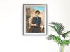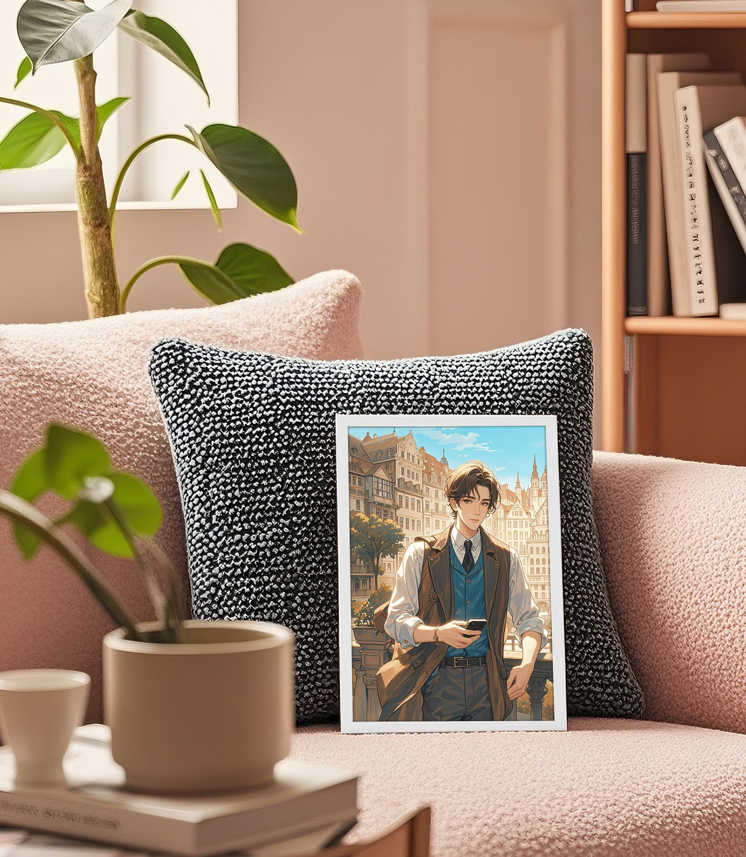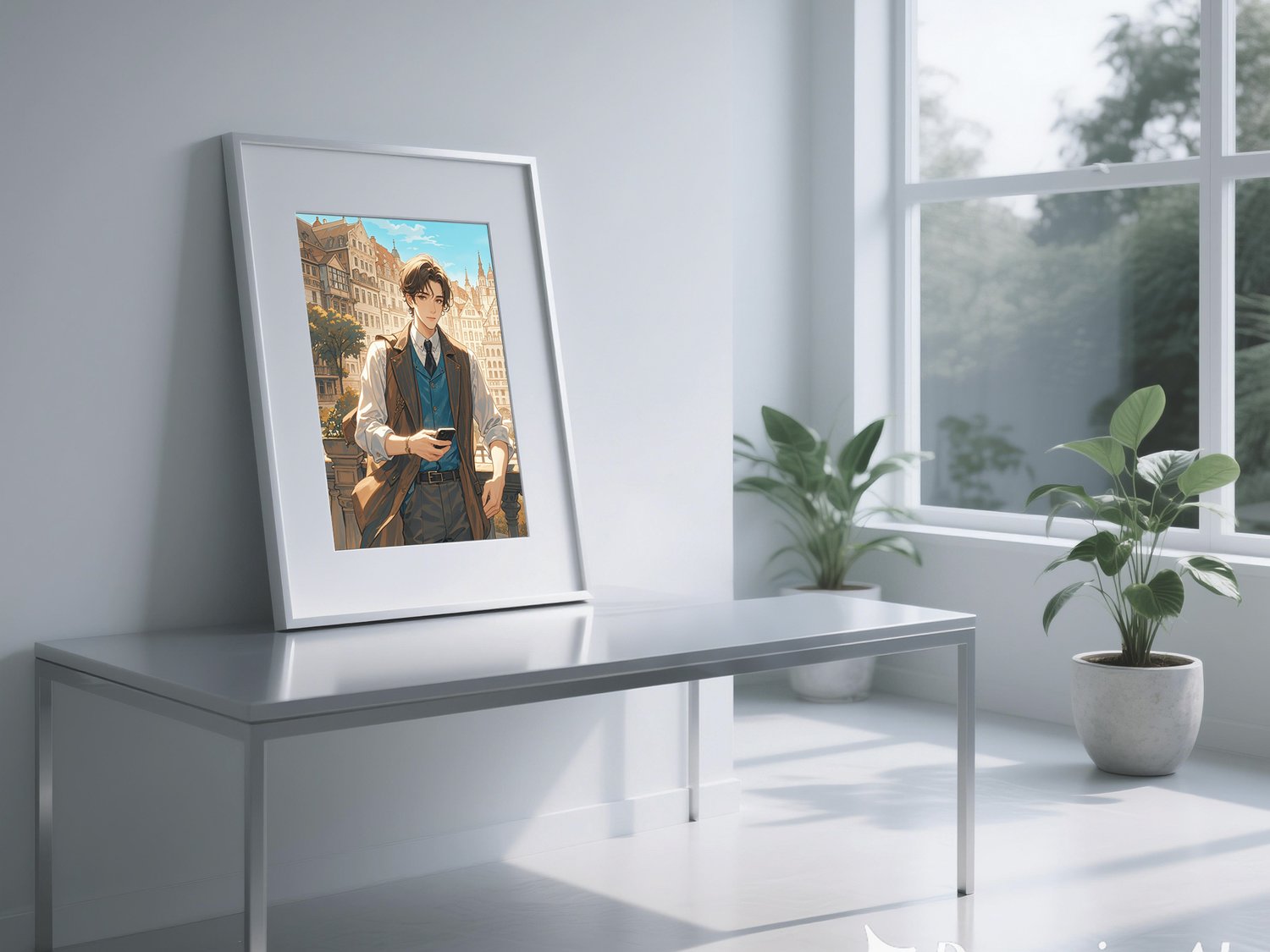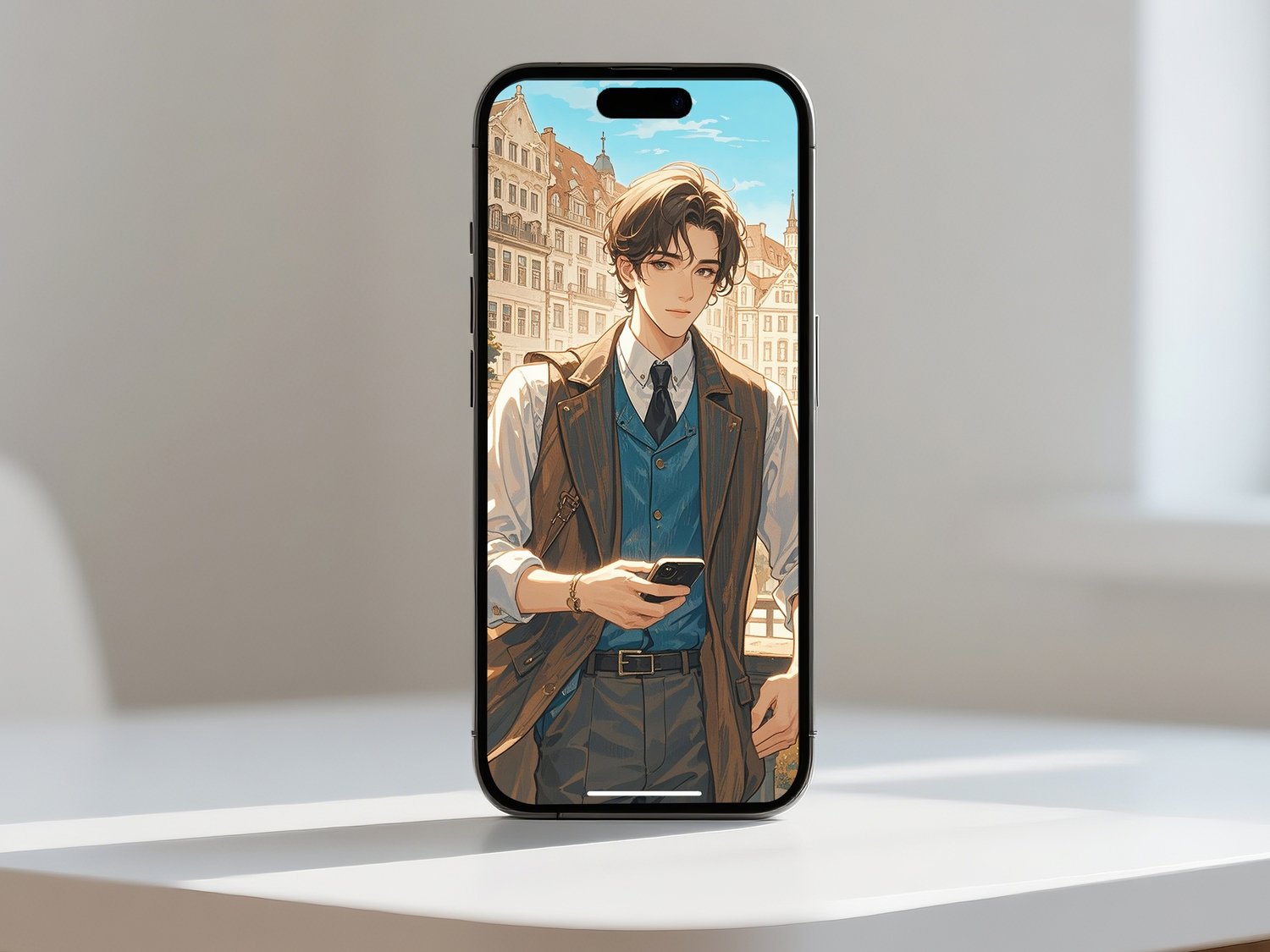 This artwork beautifully combines a sense of timeless elegance with modern elements. The European-style architecture in the background is rendered with intricate details and warm tones, creating a serene and inviting atmosphere. In contrast, the man in the foreground, dressed in contemporary attire and holding a smartphone, bridges the classical setting with the present day, resulting in a captivating juxtaposition.