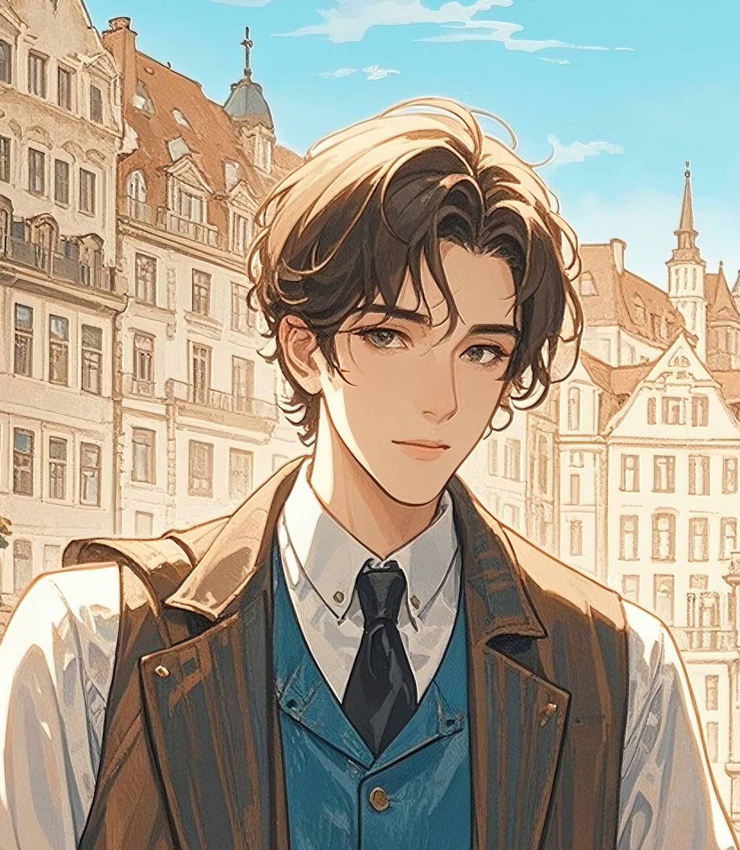 The use of light and shadow is particularly striking. The soft sunlight highlights both the buildings and the character, giving the entire scene a sense of freshness and openness. The character’s expression is calm yet refined, conveying intelligence and a sense of quiet confidence.
