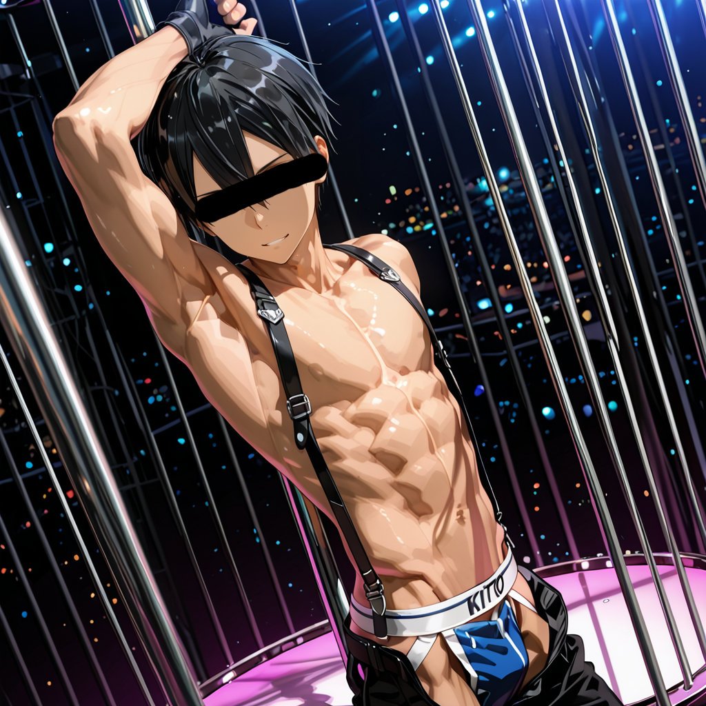 男性ショーダンサーをテーマに、ジョックストラップとサスペンダーを着せて、ポールと鳥かごをテーマに、キャラクターの魅力を存分に表現しました。