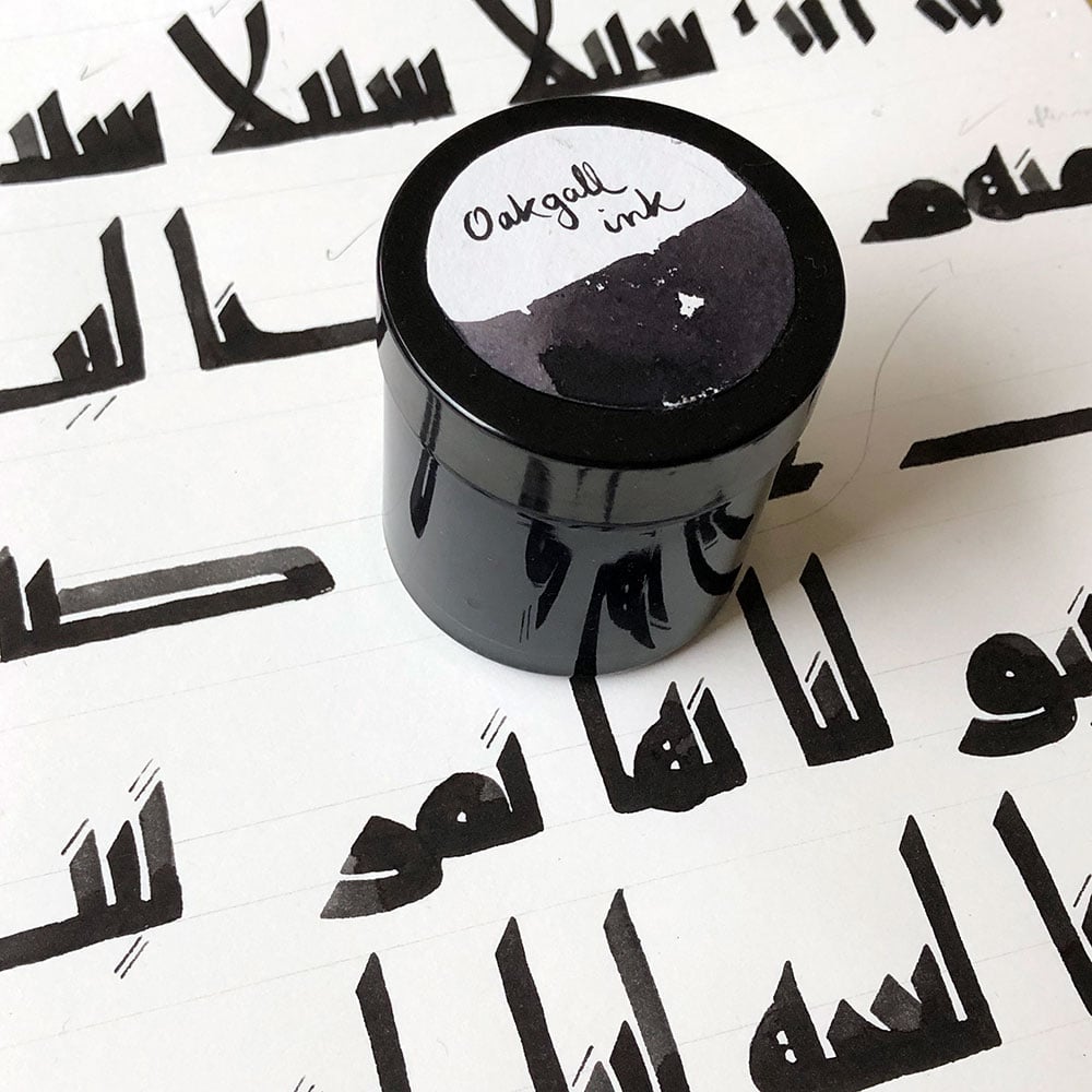 - Black ink: Tannine ink (ḥibr حبر) from gallnuts or similar, prepared from a historical recipe. The ink appears pale at first but darkens to deep black over afew hours. (If it doesn't darken, you need to work a little more wet).