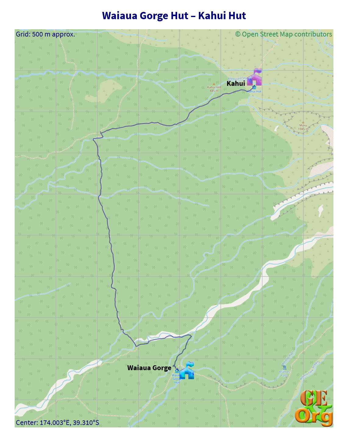 Around the Mountain Circuit, part 3, Waiaua Gorge Hut to Kahui Hut, one GPX file, one GeoJSON file, one OpenStreetMap.