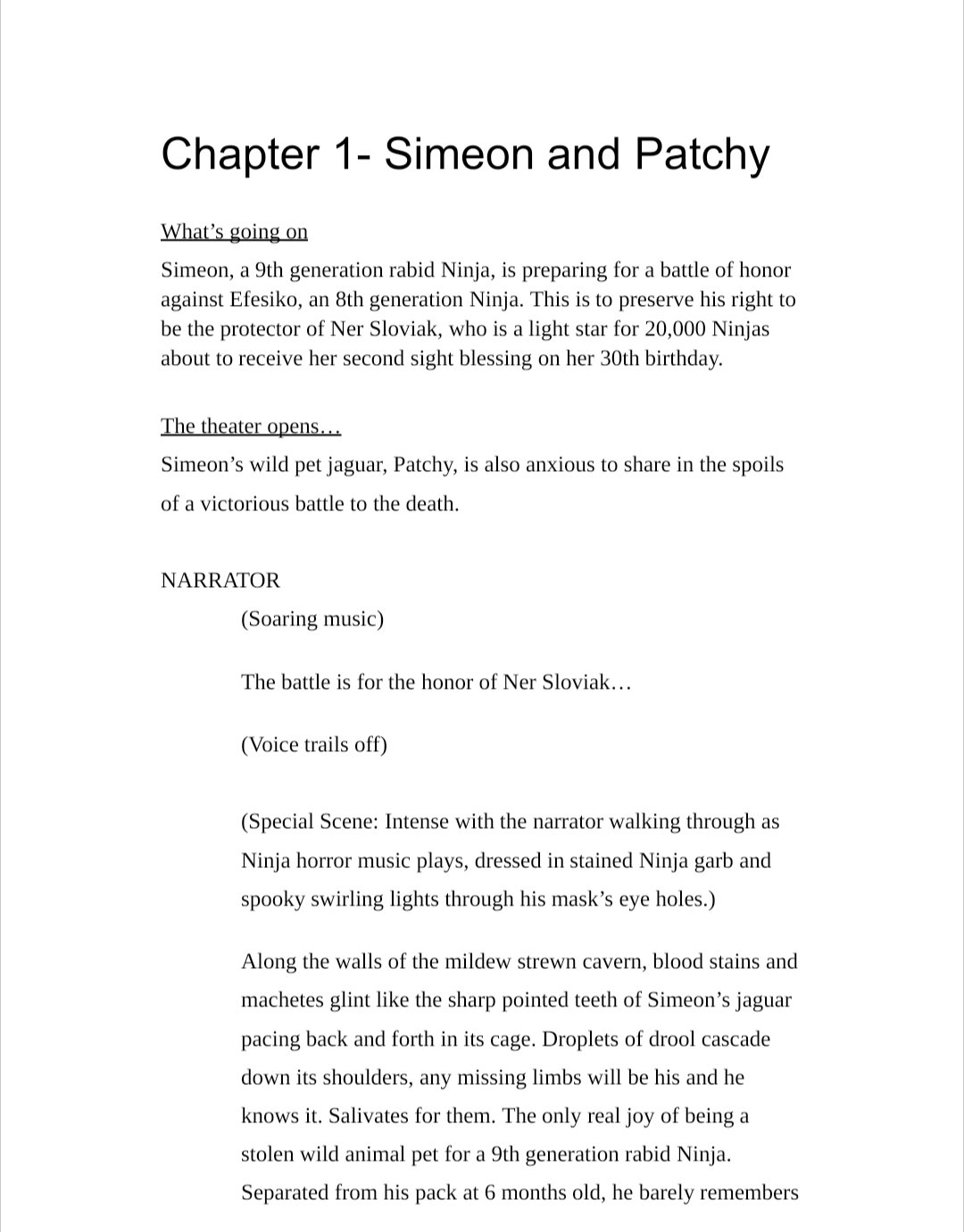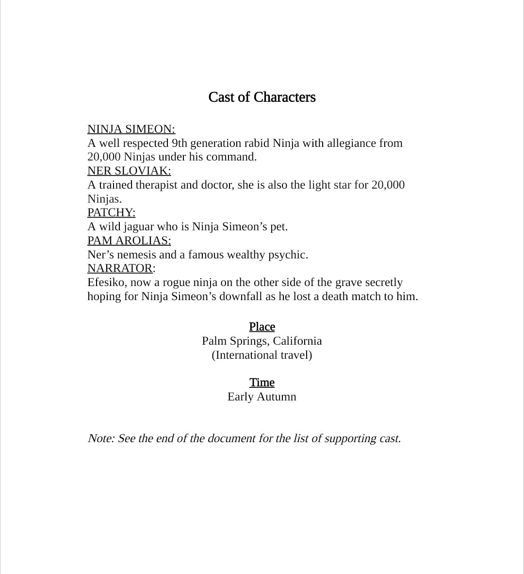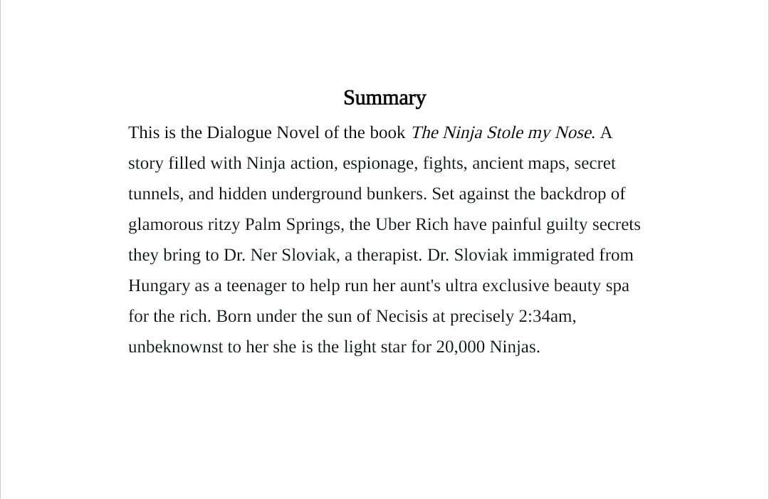 A story filled with Ninja action, espionage, fights, ancient maps, secret tunnels, and hidden underground bunkers. Set against the backdrop of glamorous ritzy Palm Springs, the Uber Rich have painful guilty secrets they bring to Dr. Ner Sloviak, a therapist. Dr. Sloviak immigrated from Hungary as a teenager to help run her aunt's ultra exclusive beauty spa for the rich. Born under the sun of Necisis at precisely 2:34am, unbeknownst to her she is the light star for 20,000 Ninjas.