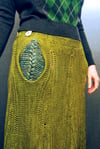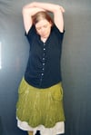 This dual-function knitted garment is a flaring wrap cardigan with short sleeves that can be turned inside out and closed off to become pockets, when you refasten it around your waist and wear it as a wraparound skirt!