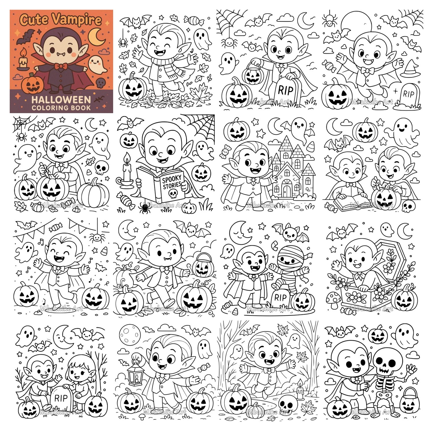 Sink your teeth into some spooky fun with the Cute Vampire Halloween Coloring Book! Each page showcases an adorable cartoon vampire in festive Halloween scenes—flying with bats, reading spooky stories, dancing with pumpkins, and exploring haunted houses. Surrounded by classic Halloween elements like ghosts, tombstones, crescent moons, candy, and stars, these playful illustrations are perfect for kids, families, and anyone who loves a lighthearted twist on spooky season.
