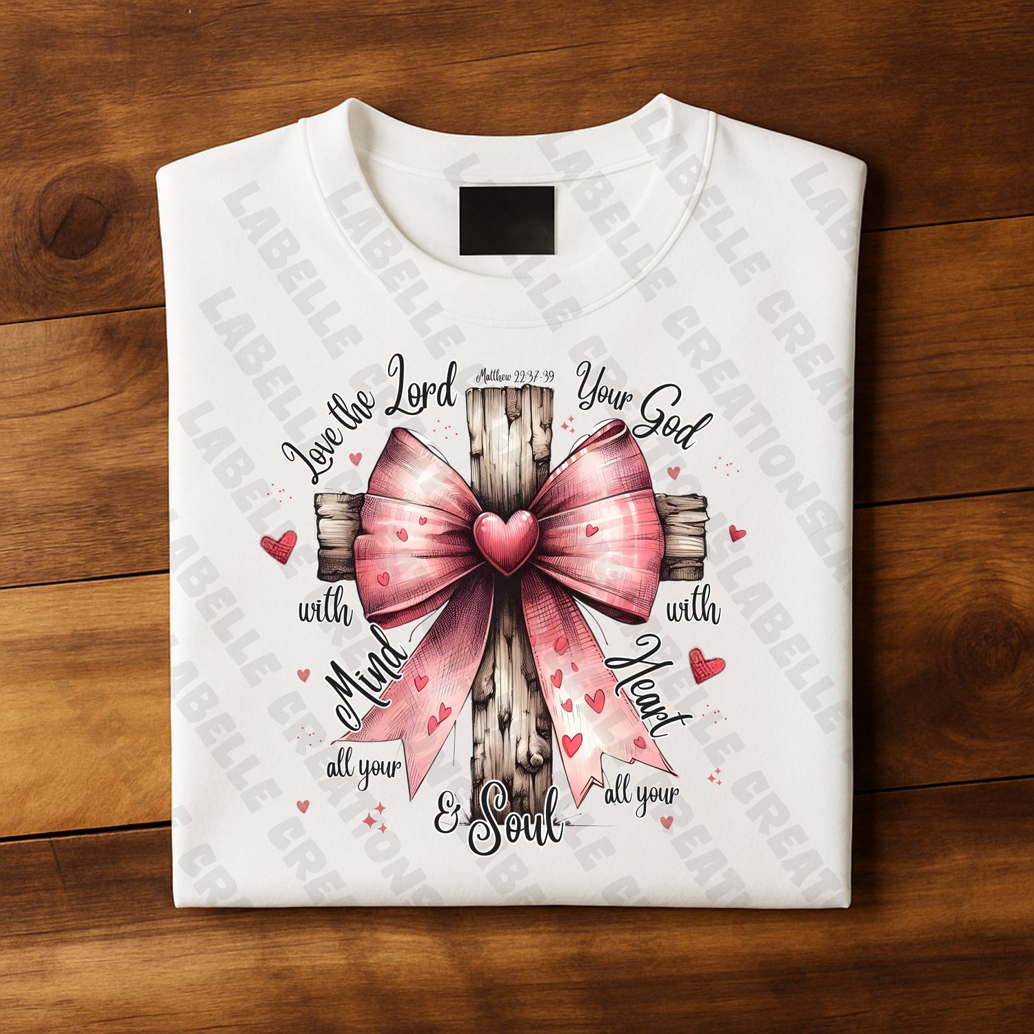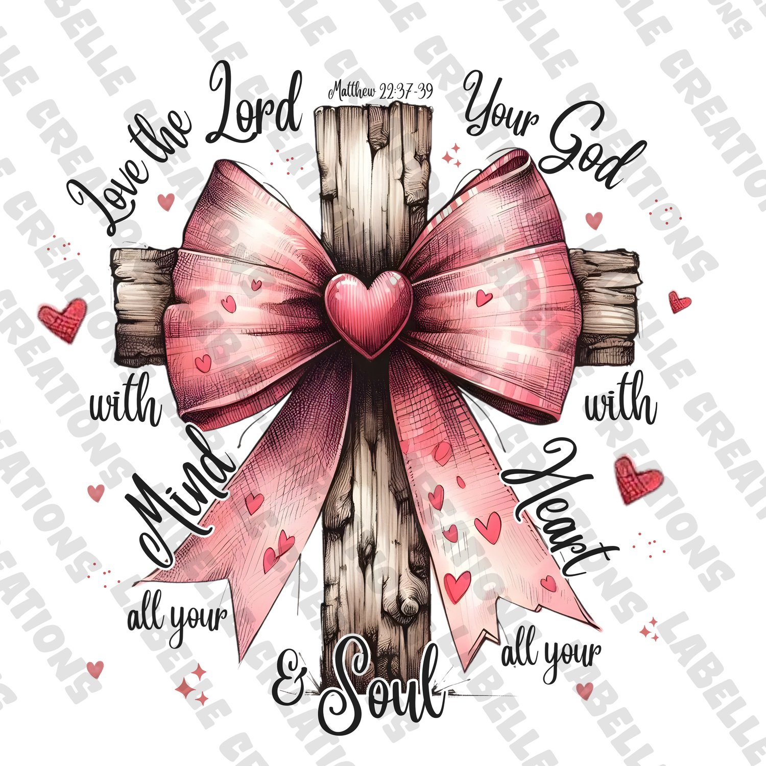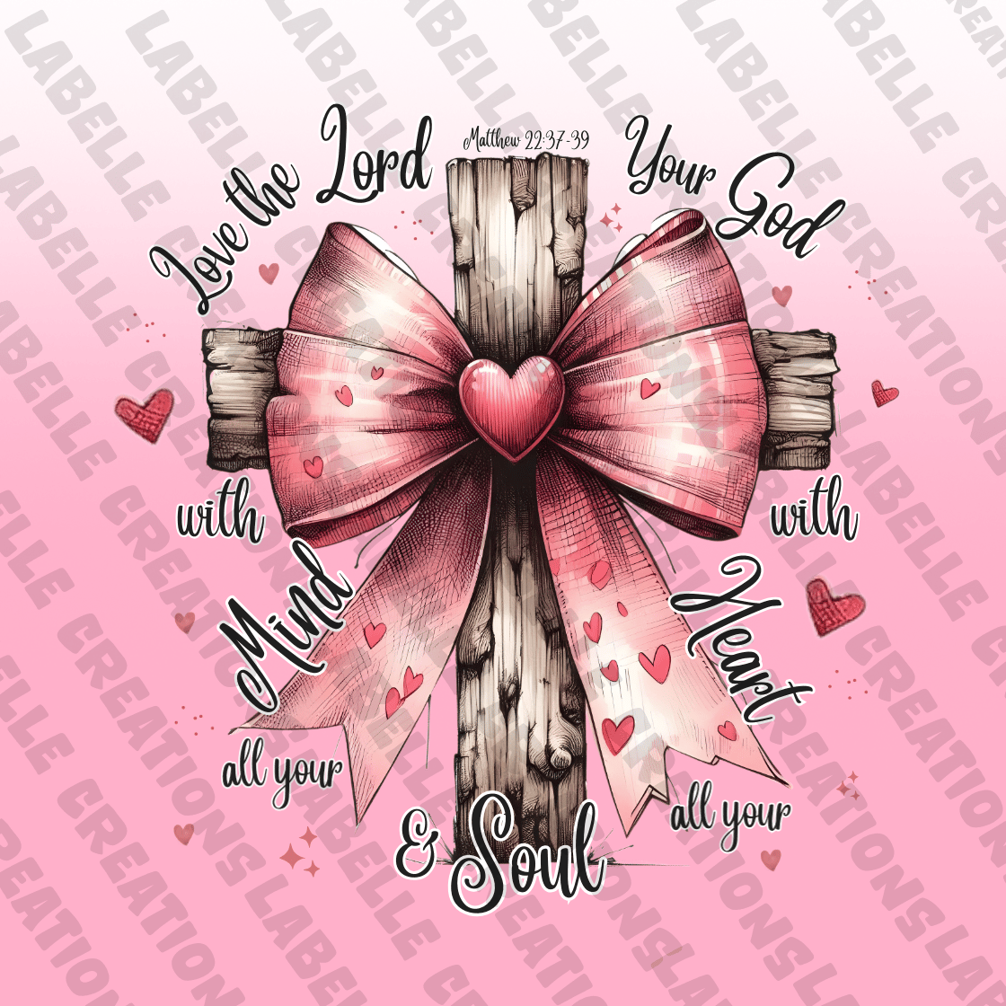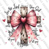 Bring faith, love, and beauty together with this heartfelt Christian artwork. This design features a rustic wooden cross adorned with a soft pink bow and heart centerpiece, surrounded by delicate hearts and sparkles. The scripture-inspired message reads: