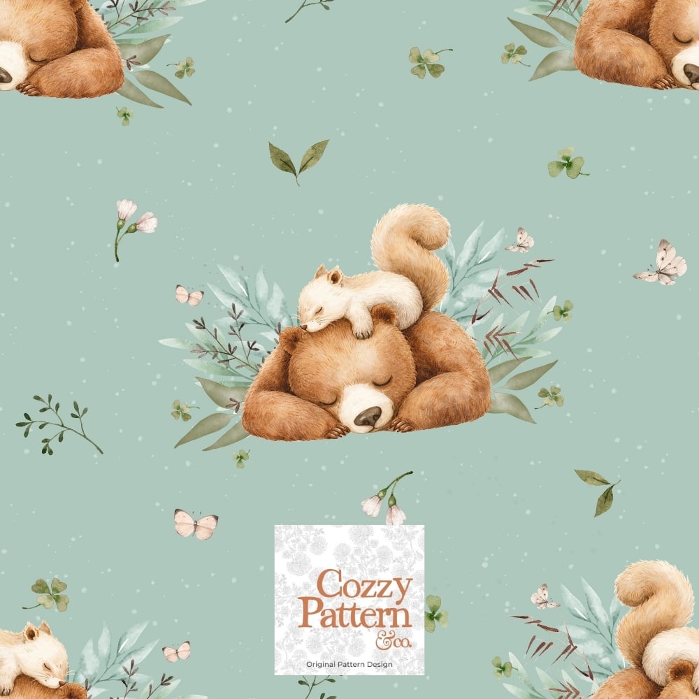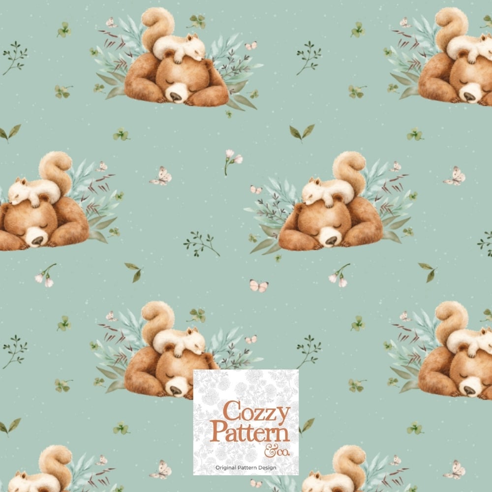 Create soft and heartwarming baby and nursery projects with this seamless woodland pattern featuring a sleeping bear gently cuddled by a baby squirrel, surrounded by delicate leaves, flowers and tiny butterflies.